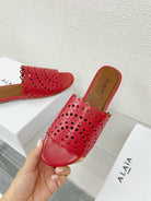 ALAIA VIENNE FLAT MULES IN CHERRY RED LAMBSKIN