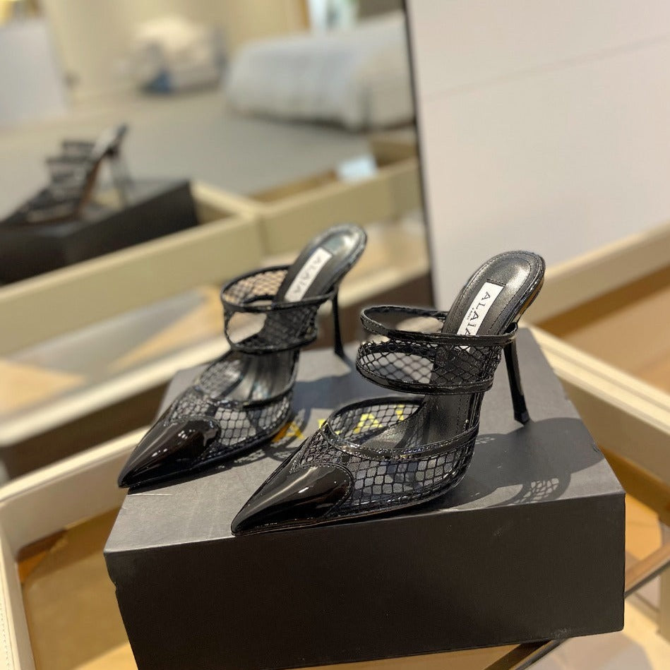ALAIA FLAT MULES IN BLACK MESH FISHNET