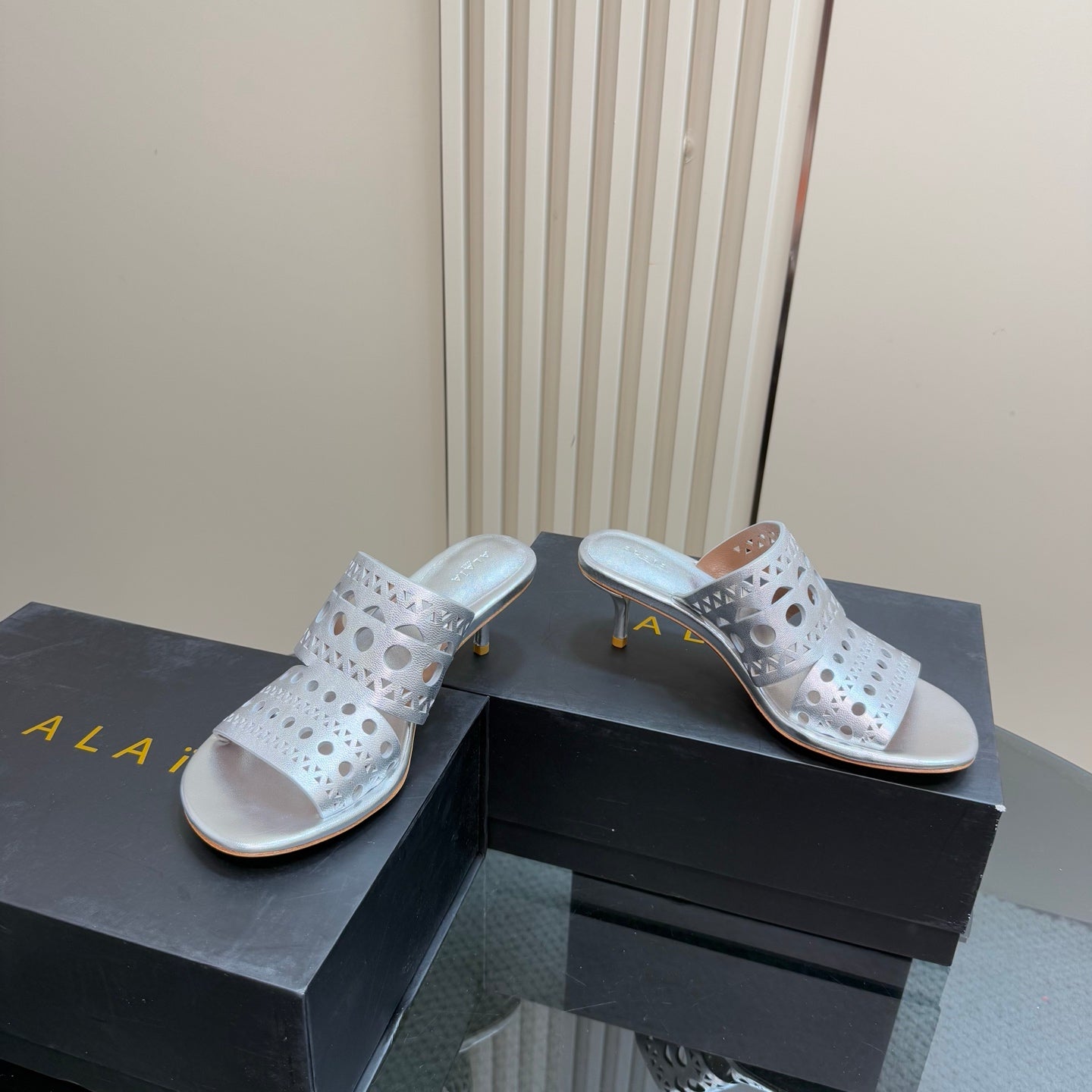 Alaia Vienne Cutout Kitten-Heel Slide Sandals Silver Sheepskin 299664