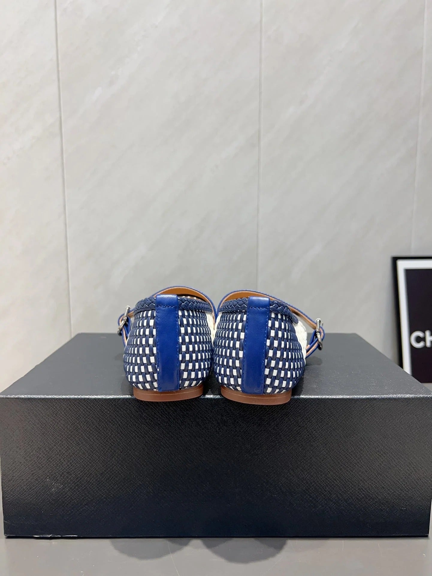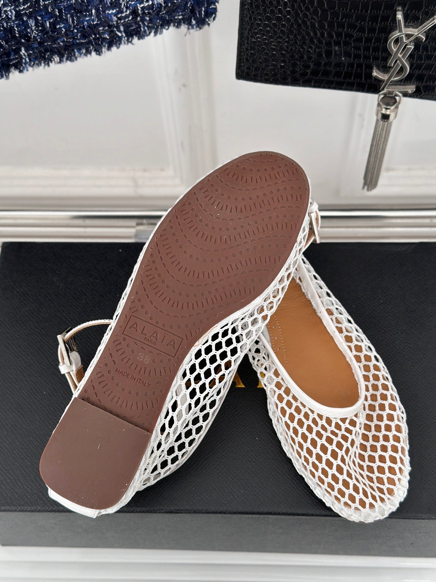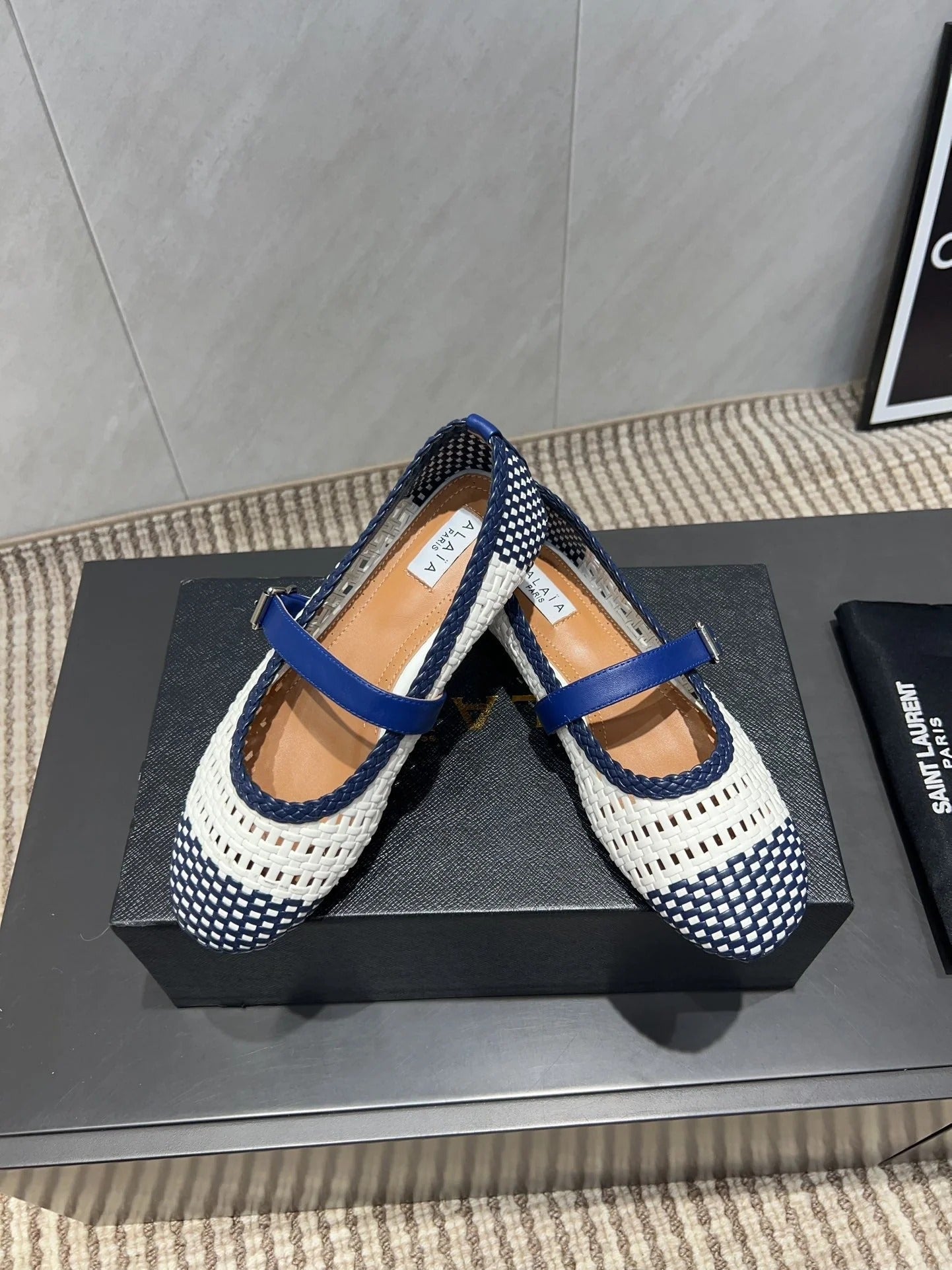 ALAIA MARY JANE FLATS white mix navy blue woven calfskin pattent