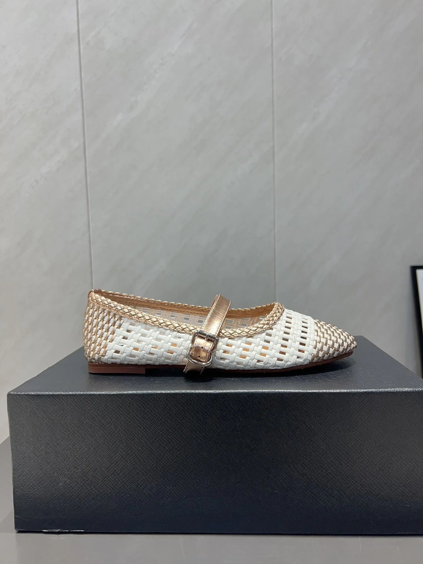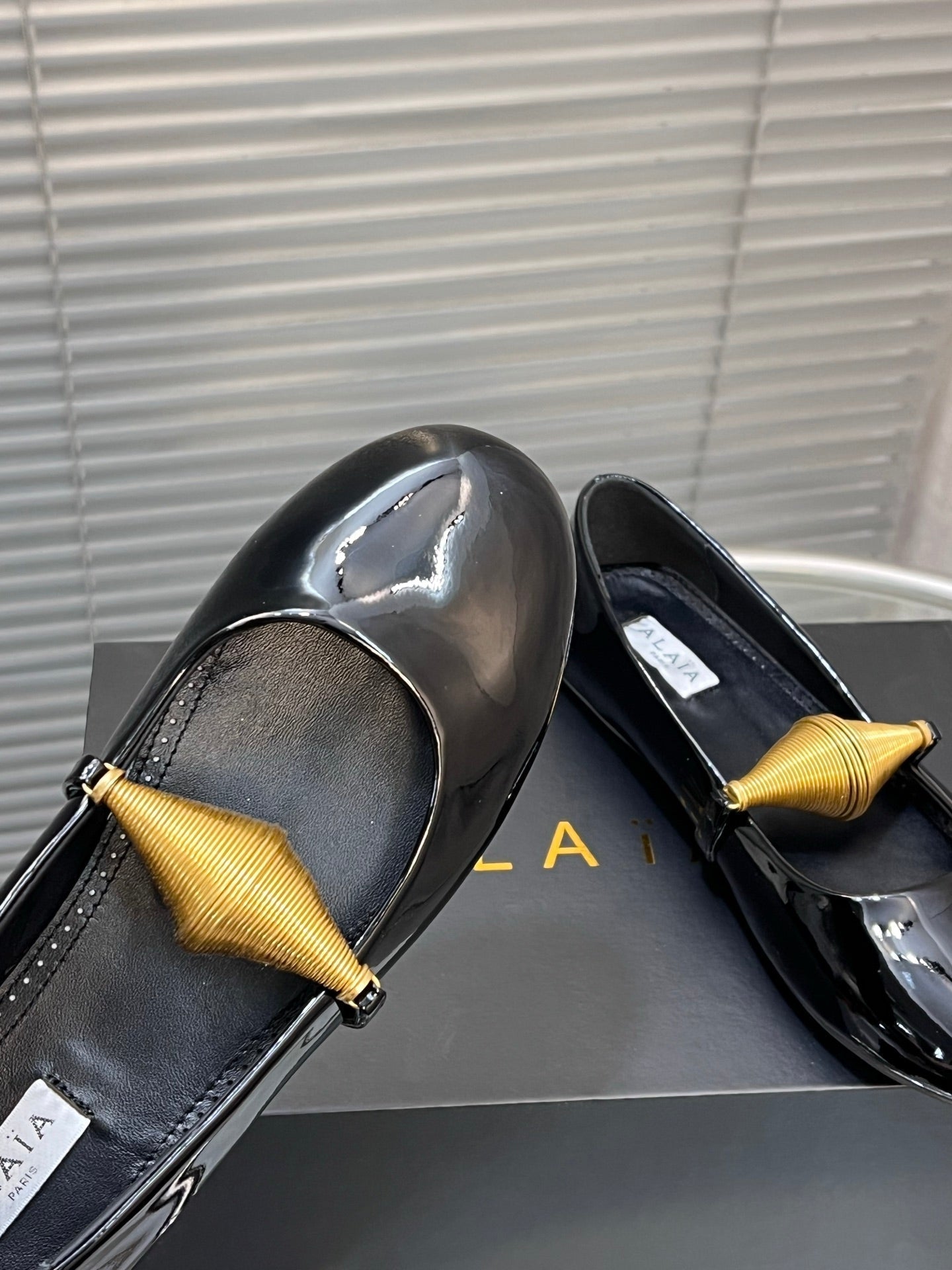 ALAIA MARY JANE FLATS white mix metallic champagne gold woven calfskin pattent