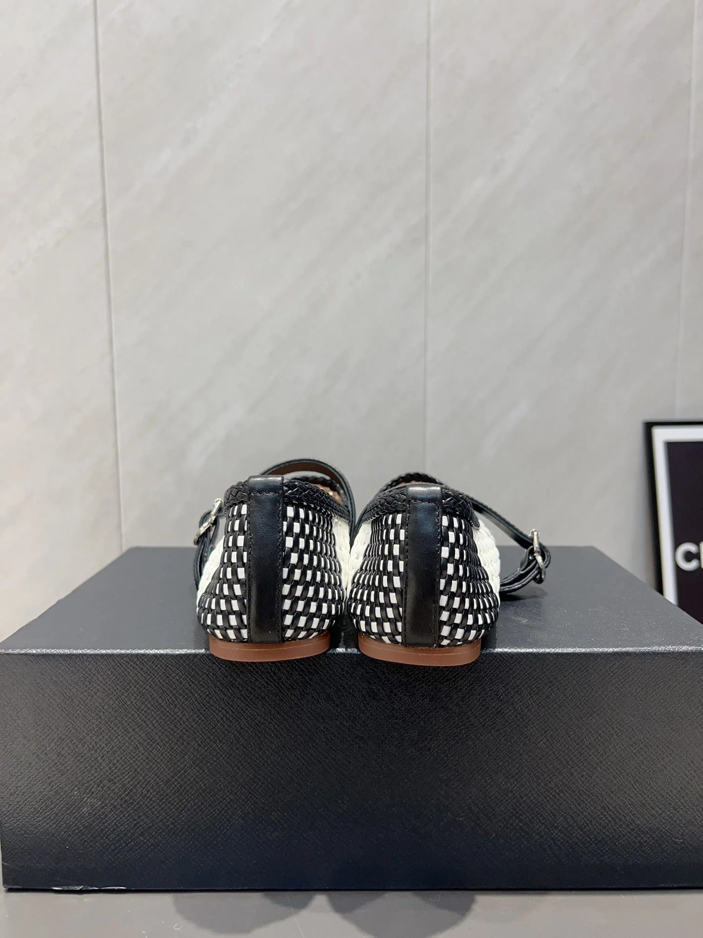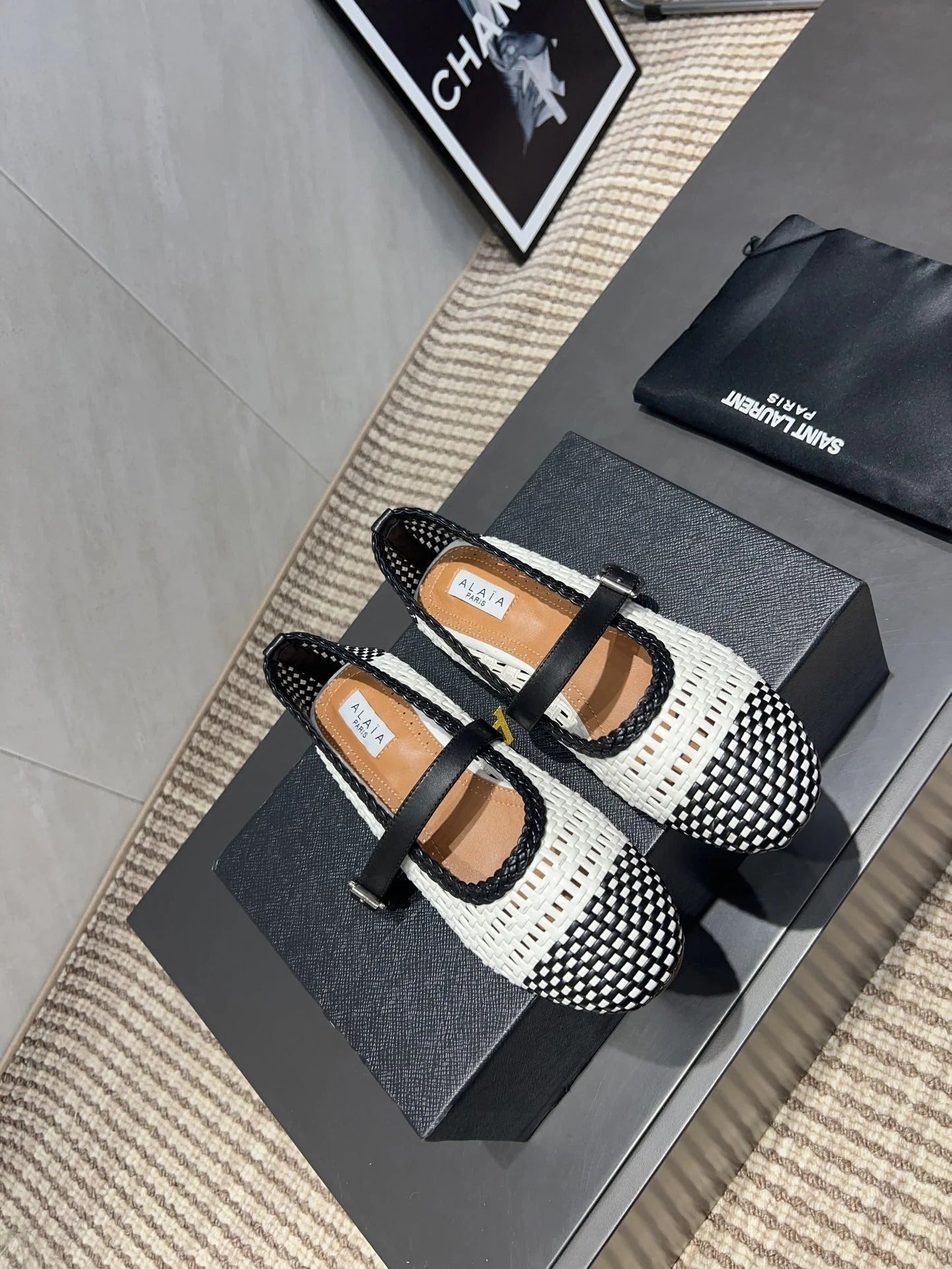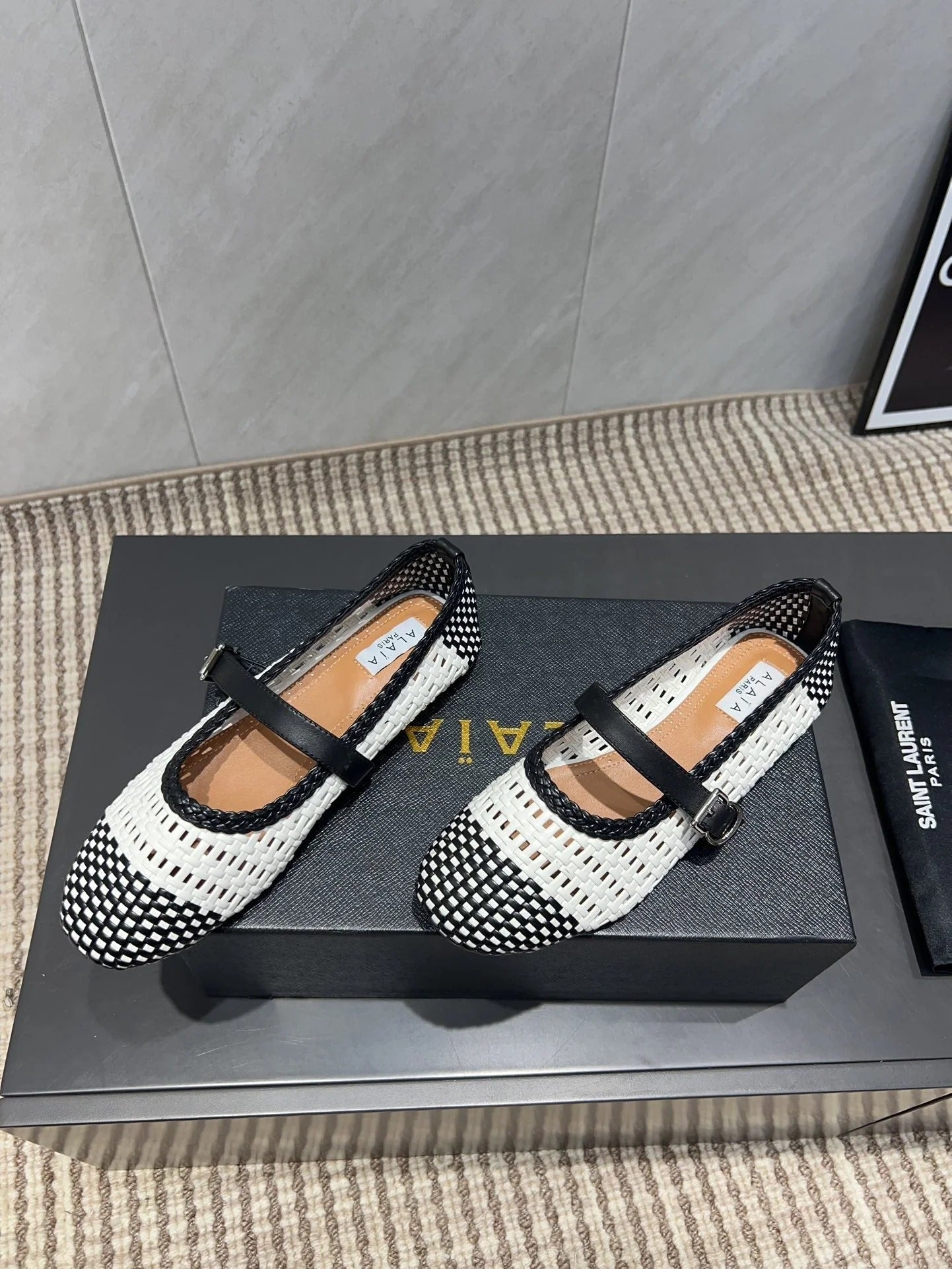 ALAIA MARY JANE FLATS white mix black woven calfskin pattent