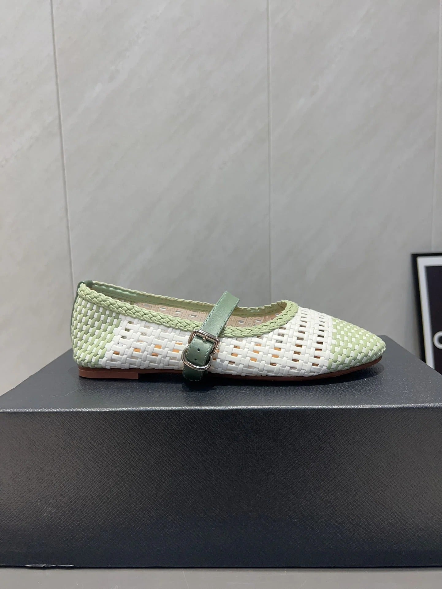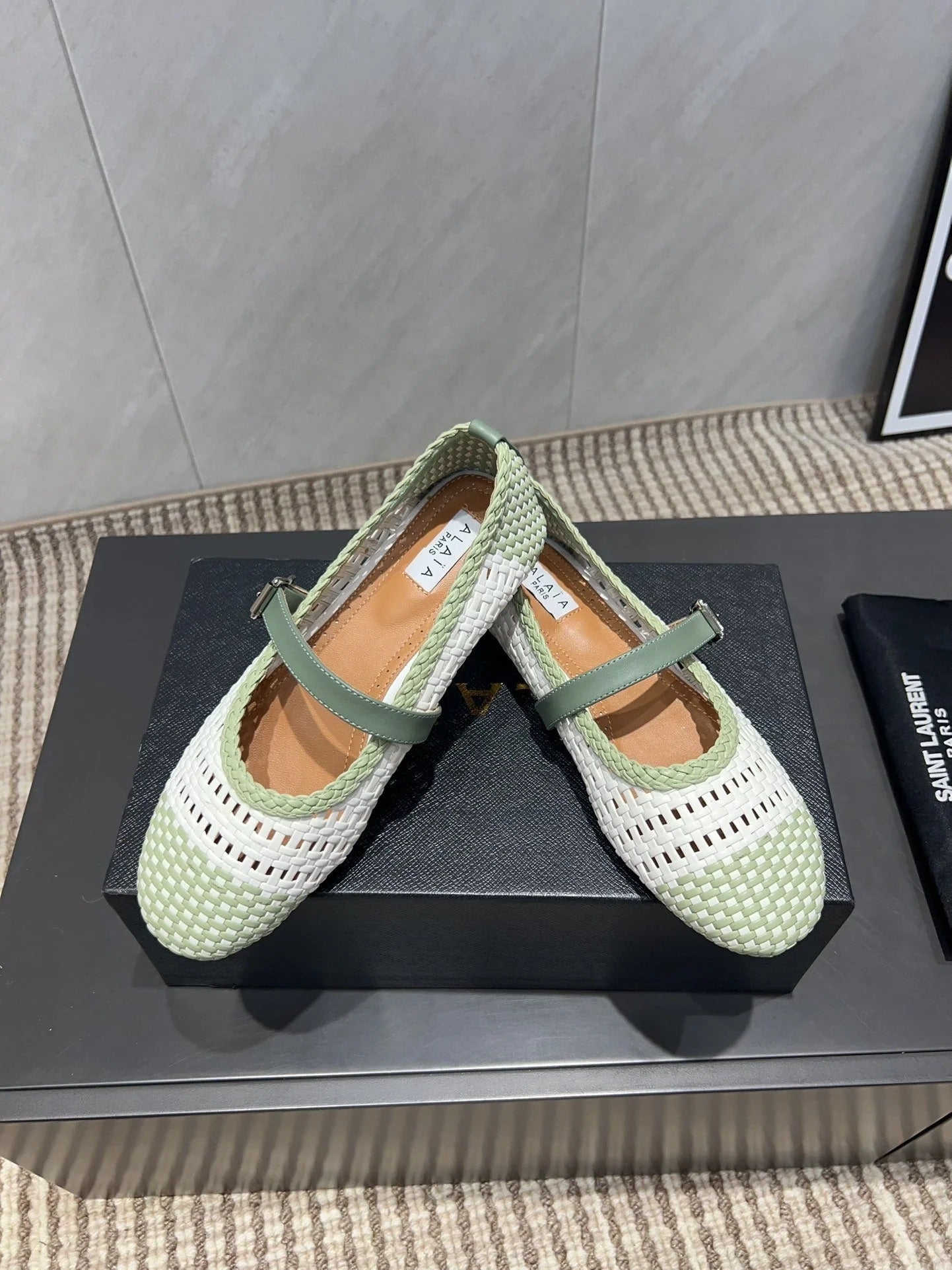 ALAIA MARY JANE FLATS soft green and white woven calfskin pattent
