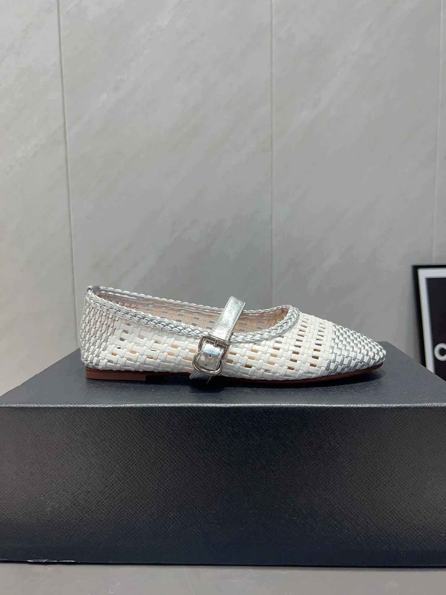 ALAIA MARY JANE FLATS white mix gray woven calfskin pattent