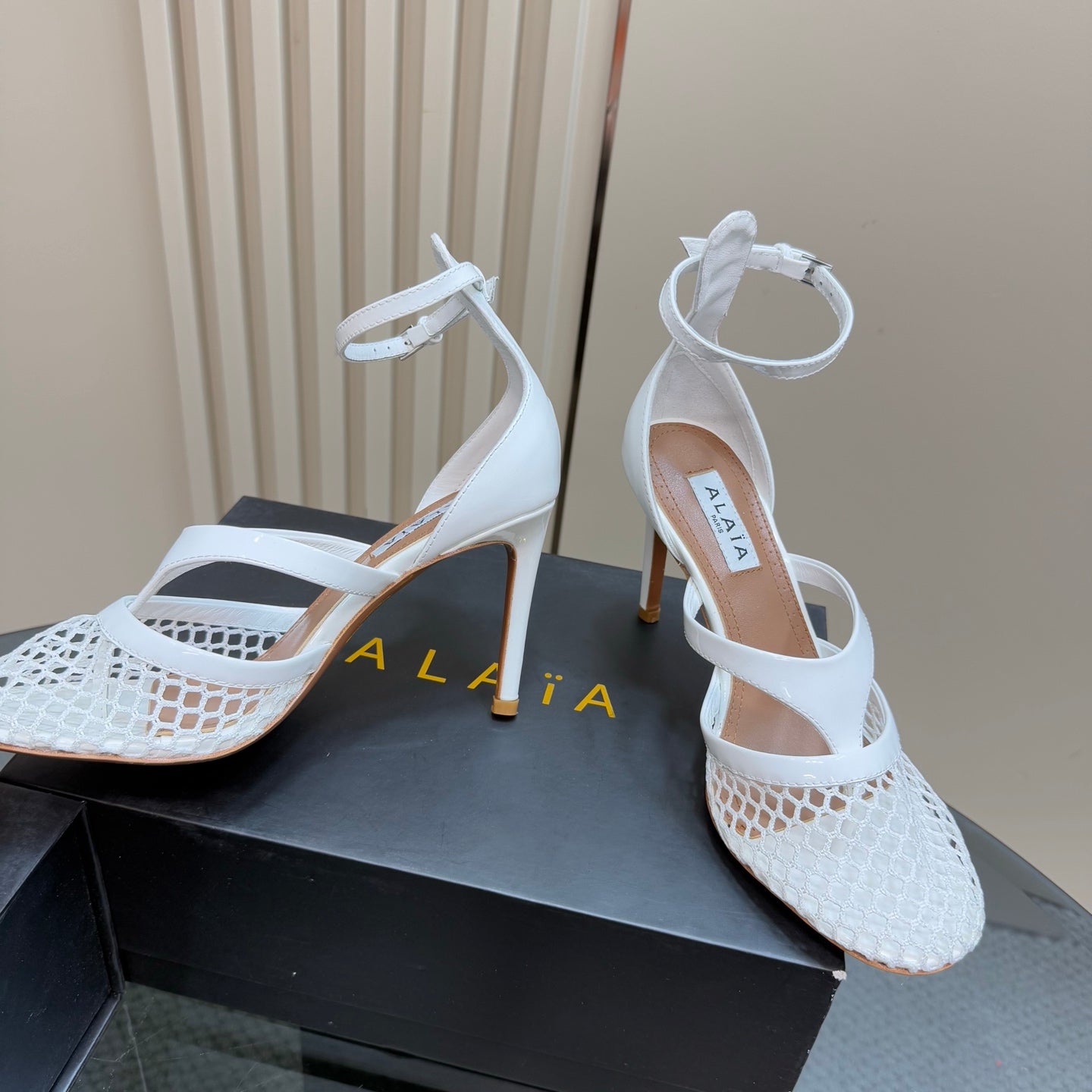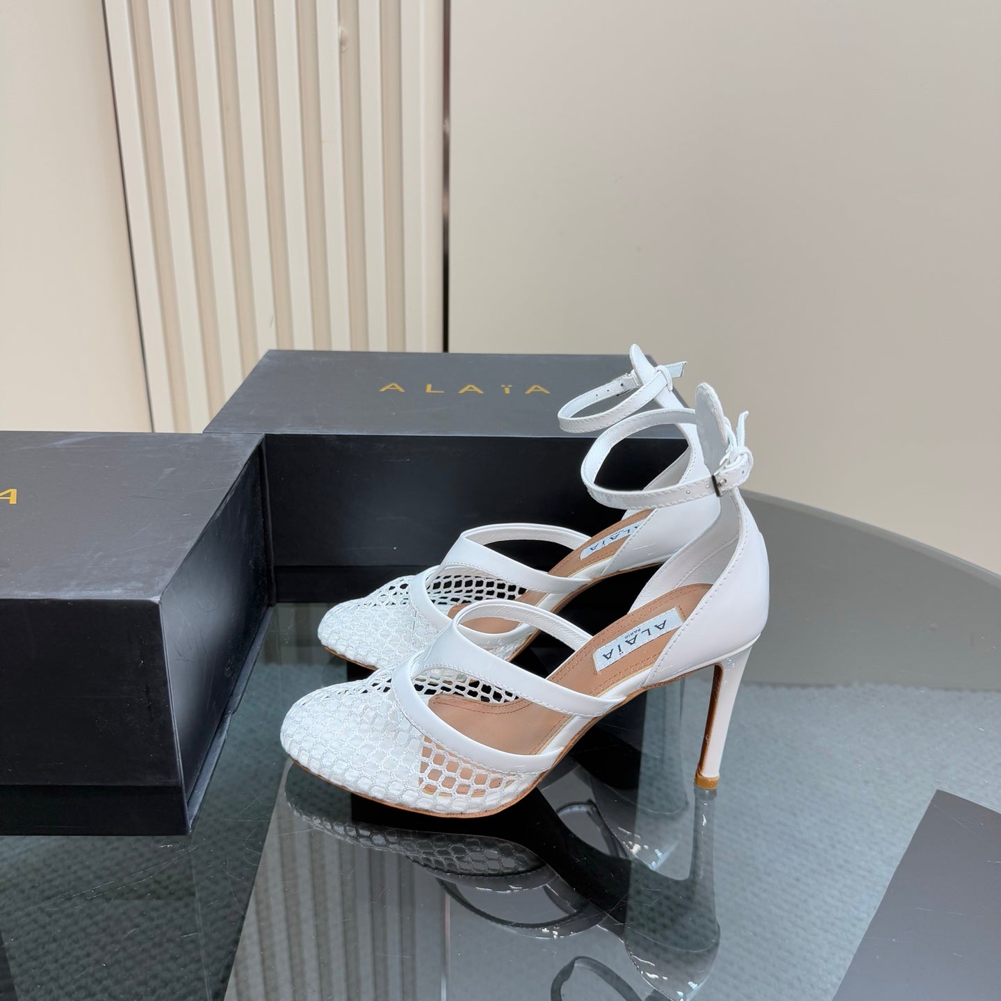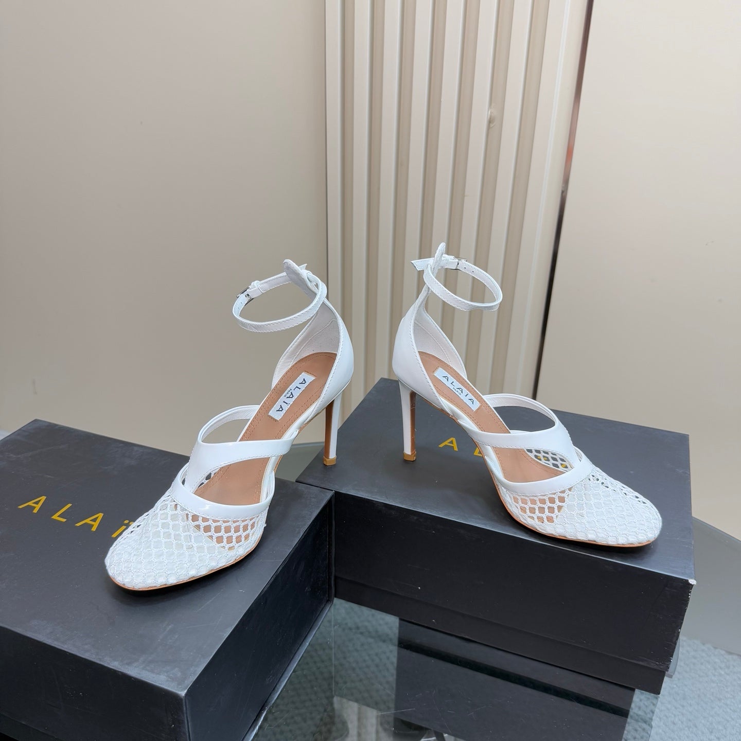 Alaia Fishnet Thong Heels Sandals White Lambskin 299659