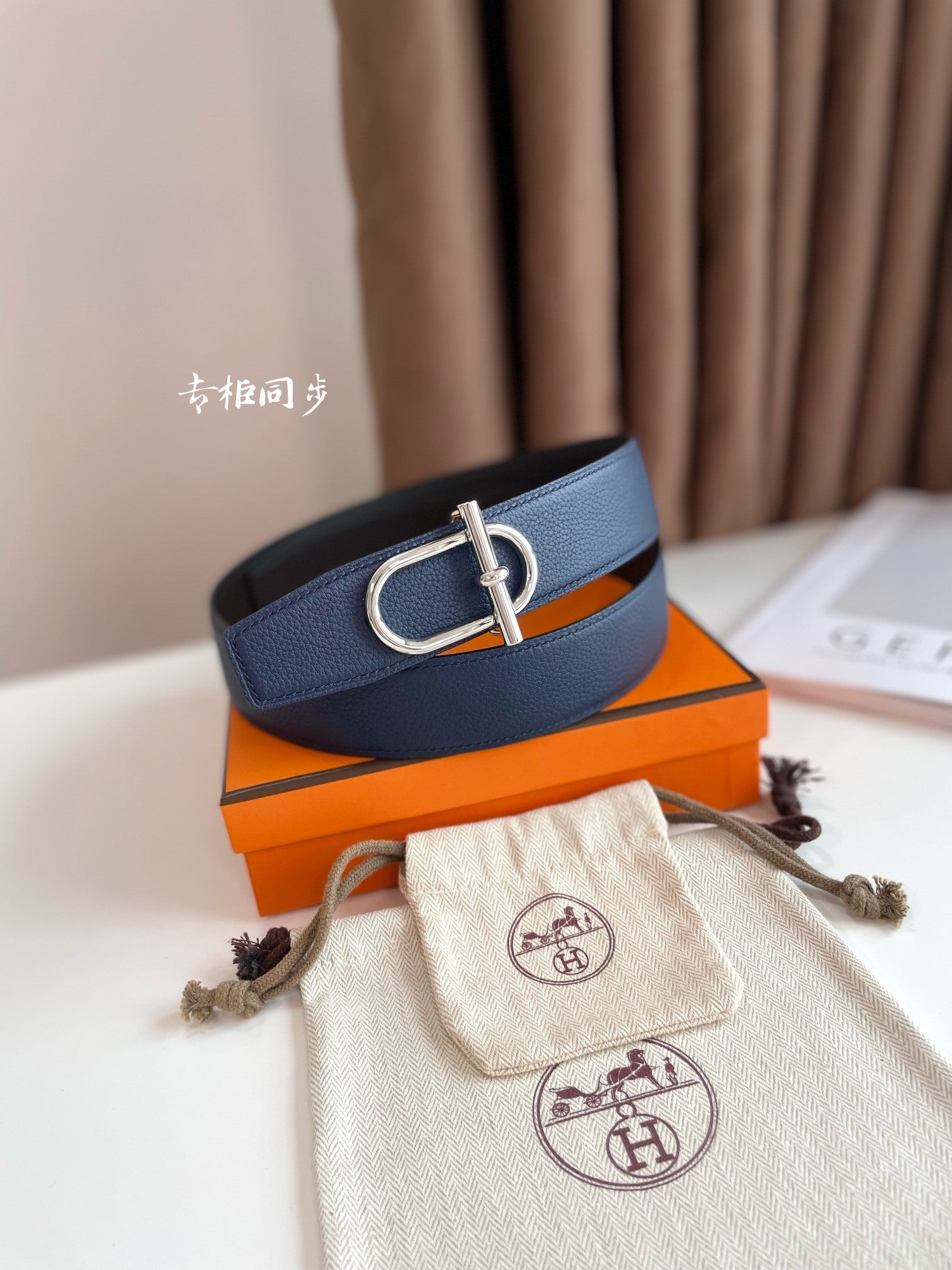 HM ITHAQUE BELT SILVER BUCKLE & REVERSIBLE NAVY BLUE AND BLACK LEATHER STRAP 38MM