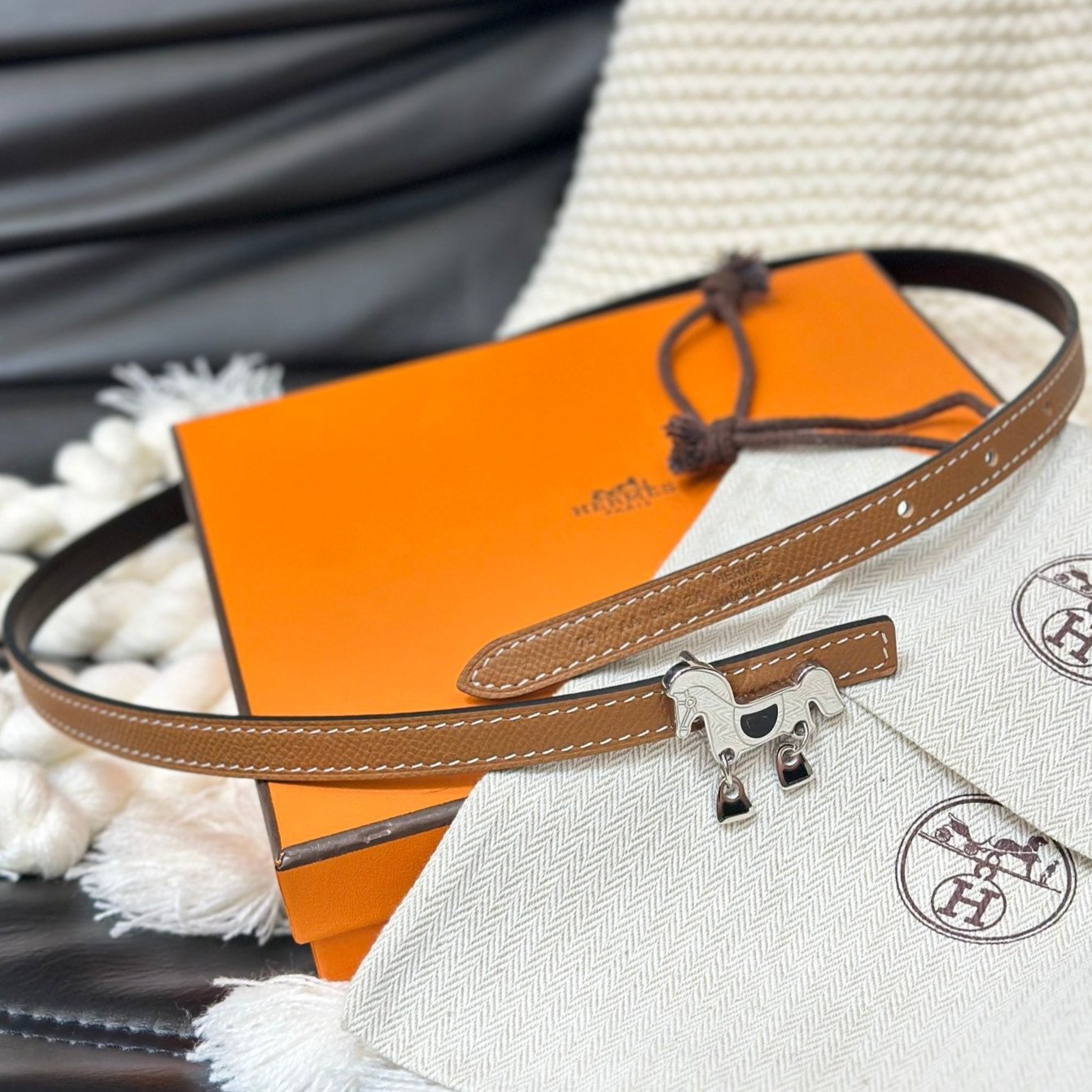 HM KELLY POCKET 18MM BELT CINNAMON BROWN LEATHER SILVER HARDWARE