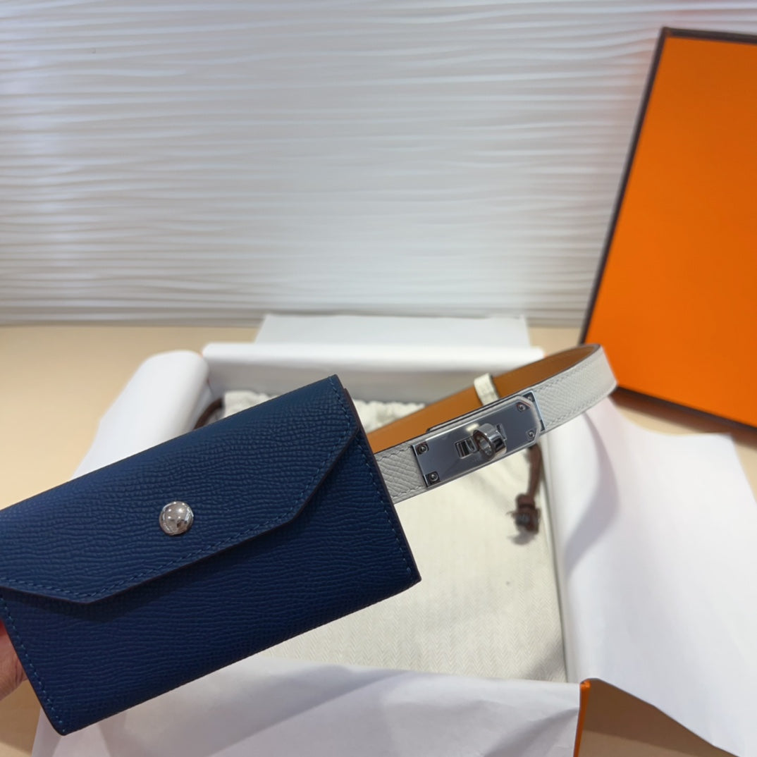 HM KELLY NAVY BLUE POCKET 18MM BELT WHITE LEATHER GOLD HARDWARE