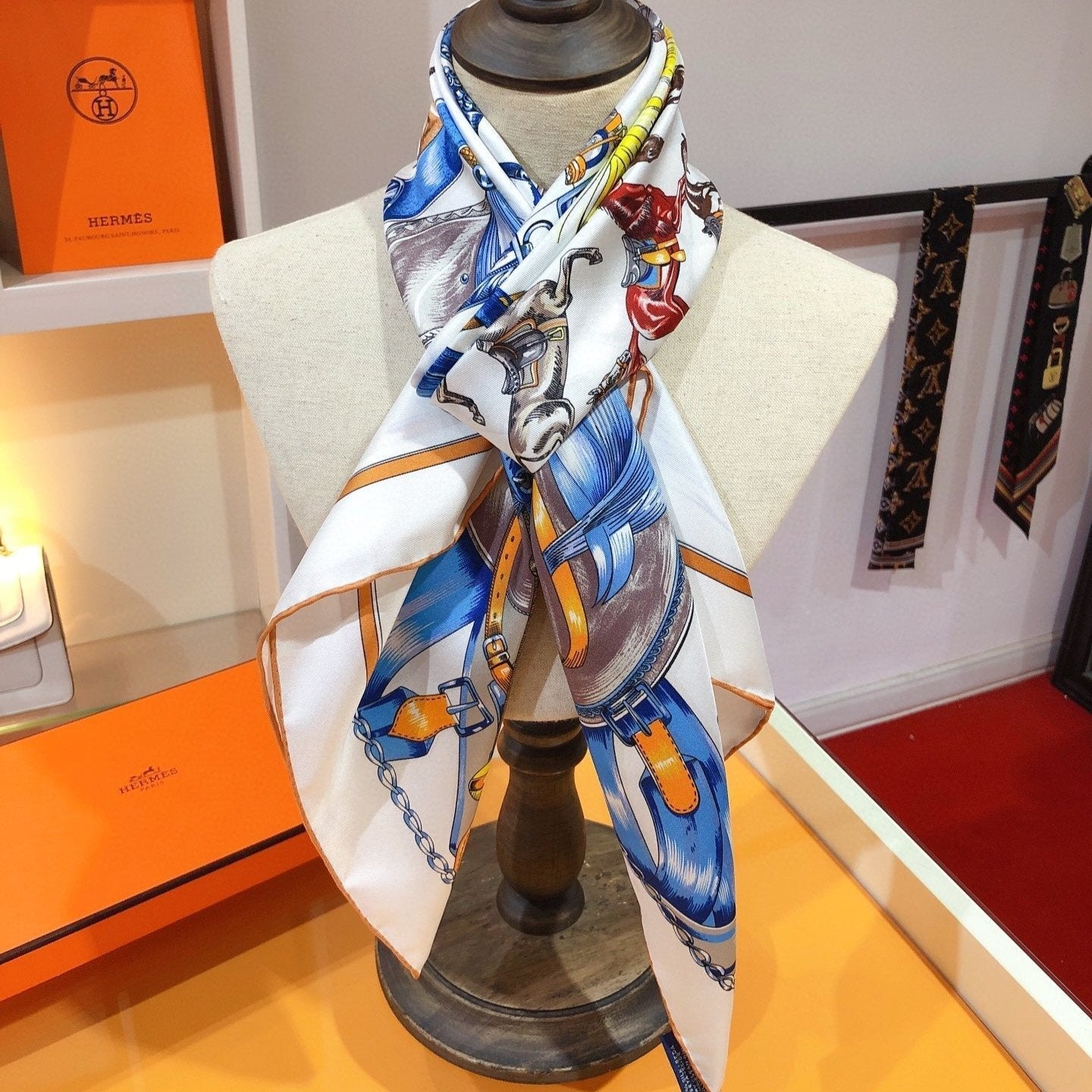 Cavalcades Scarf 90 CM In White Orange Colorful Silk Twill 288858