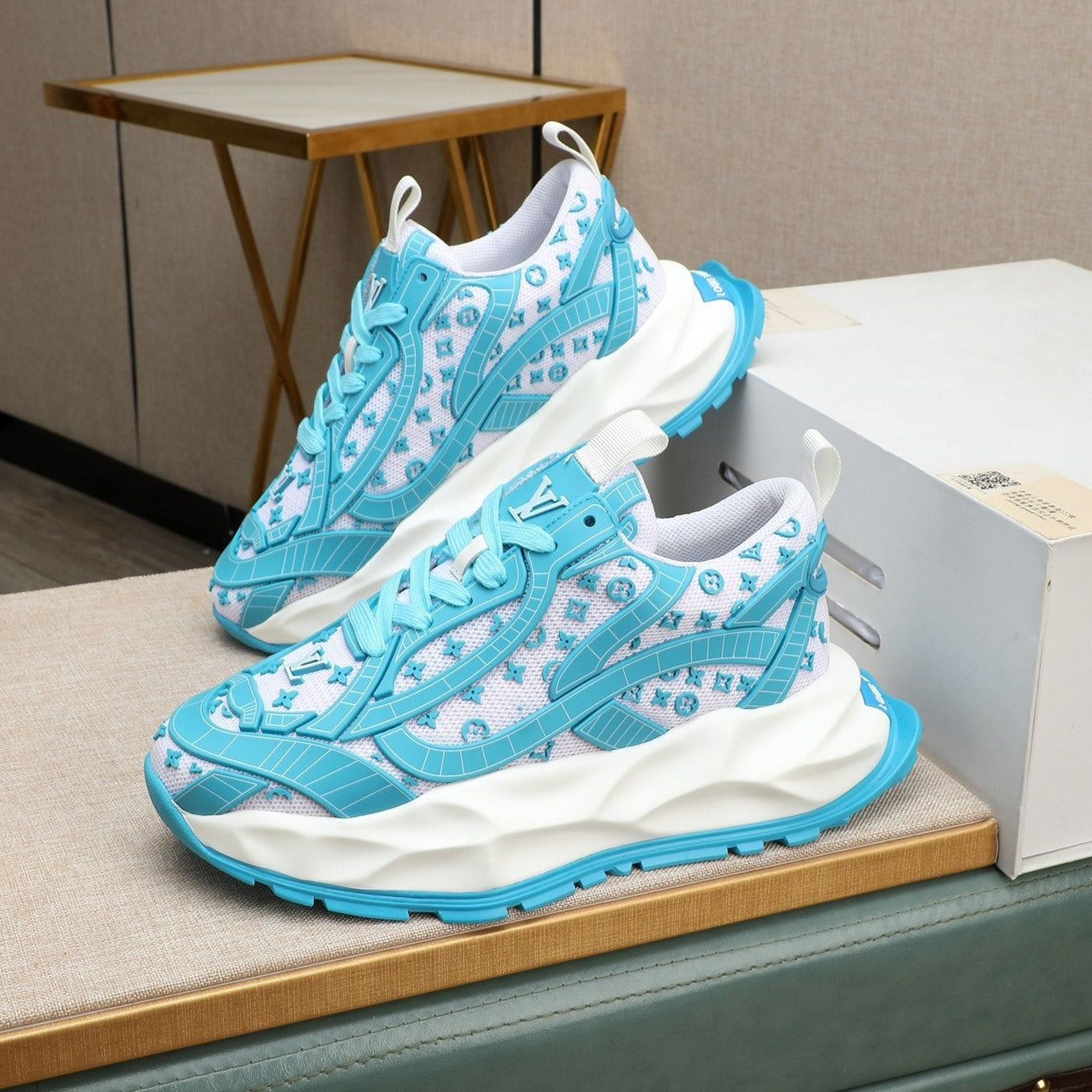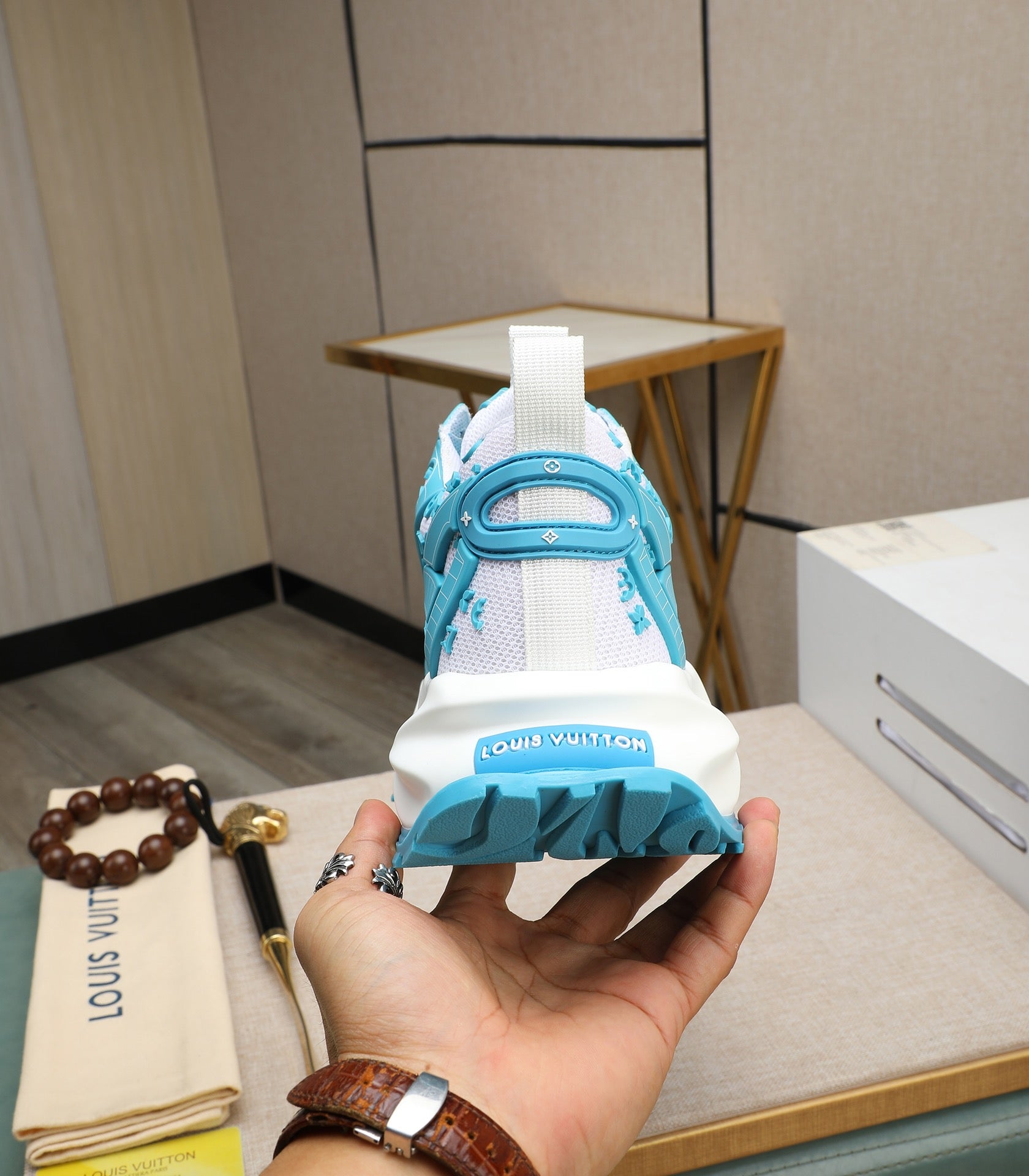LV TRAINER WHITE MIX BLUE CALFSKIN AND BREATHABLE MESH