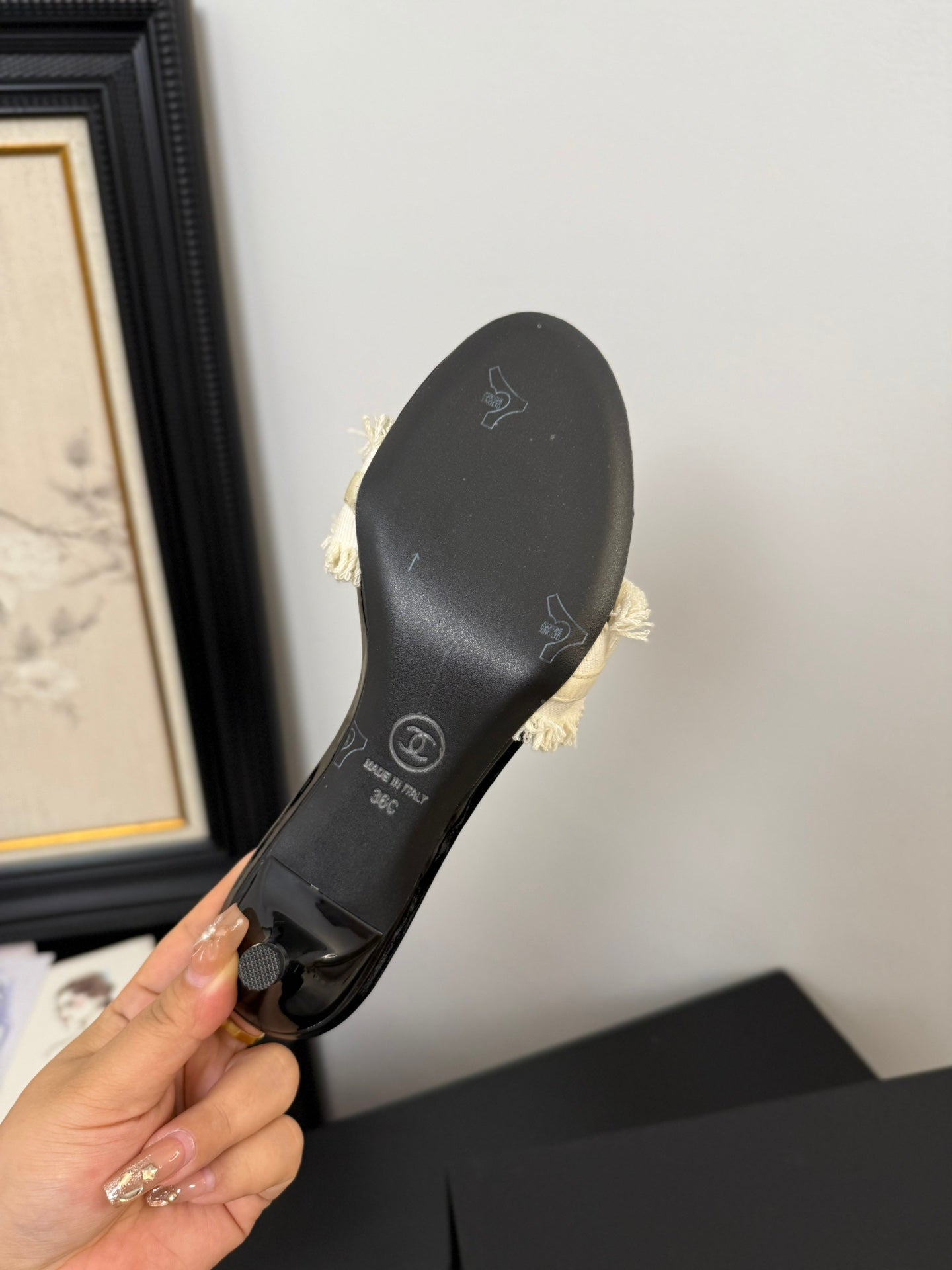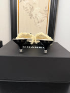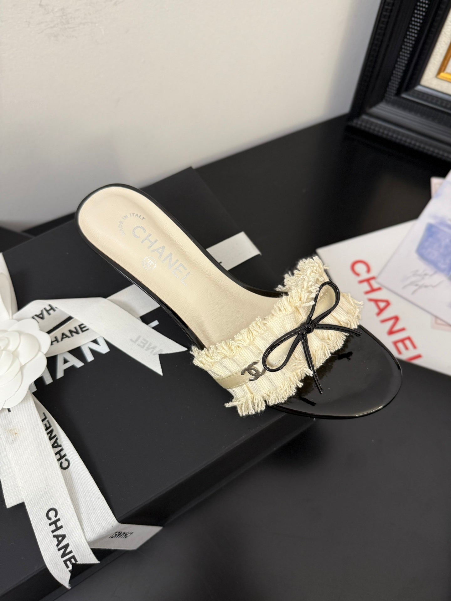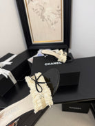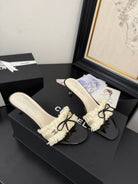cc25 slide sandal 65mm ruffle bow heels black grosgrain white canvas 233582