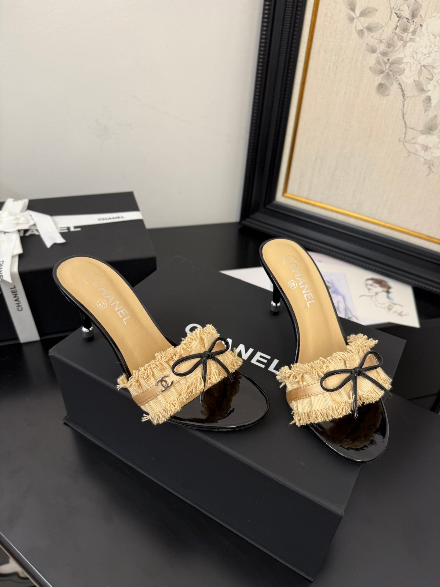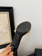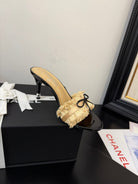 cc25 slide sandal 90mm ruffle bow heels black grosgrain gold canvas 233586