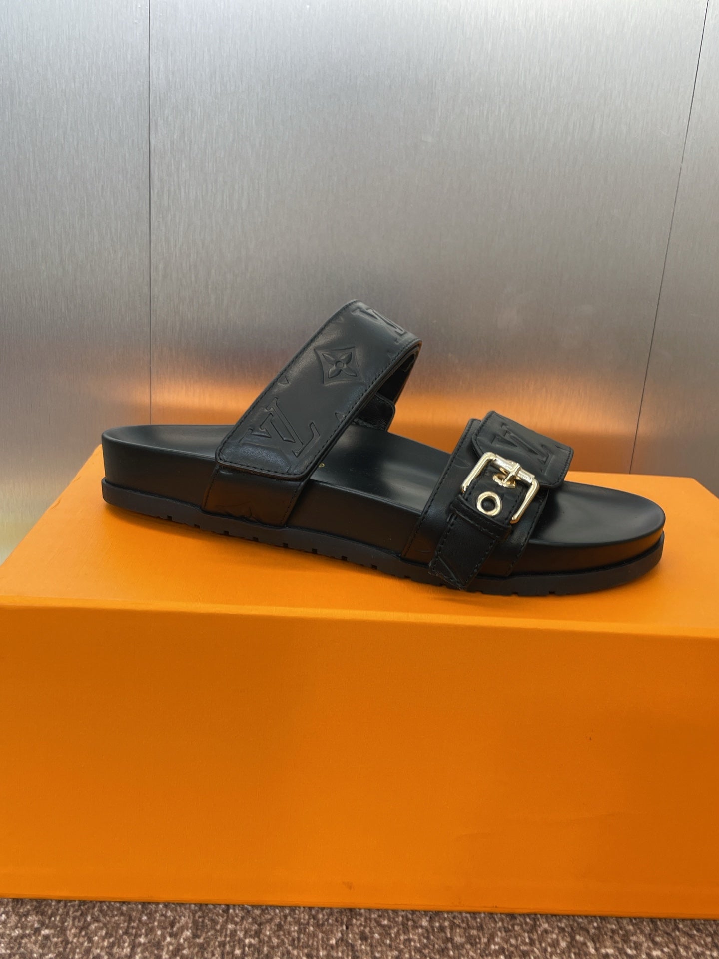 LV 2025 Hardware Buckle Open-toe Sandal Black Gold Cowhide 330223