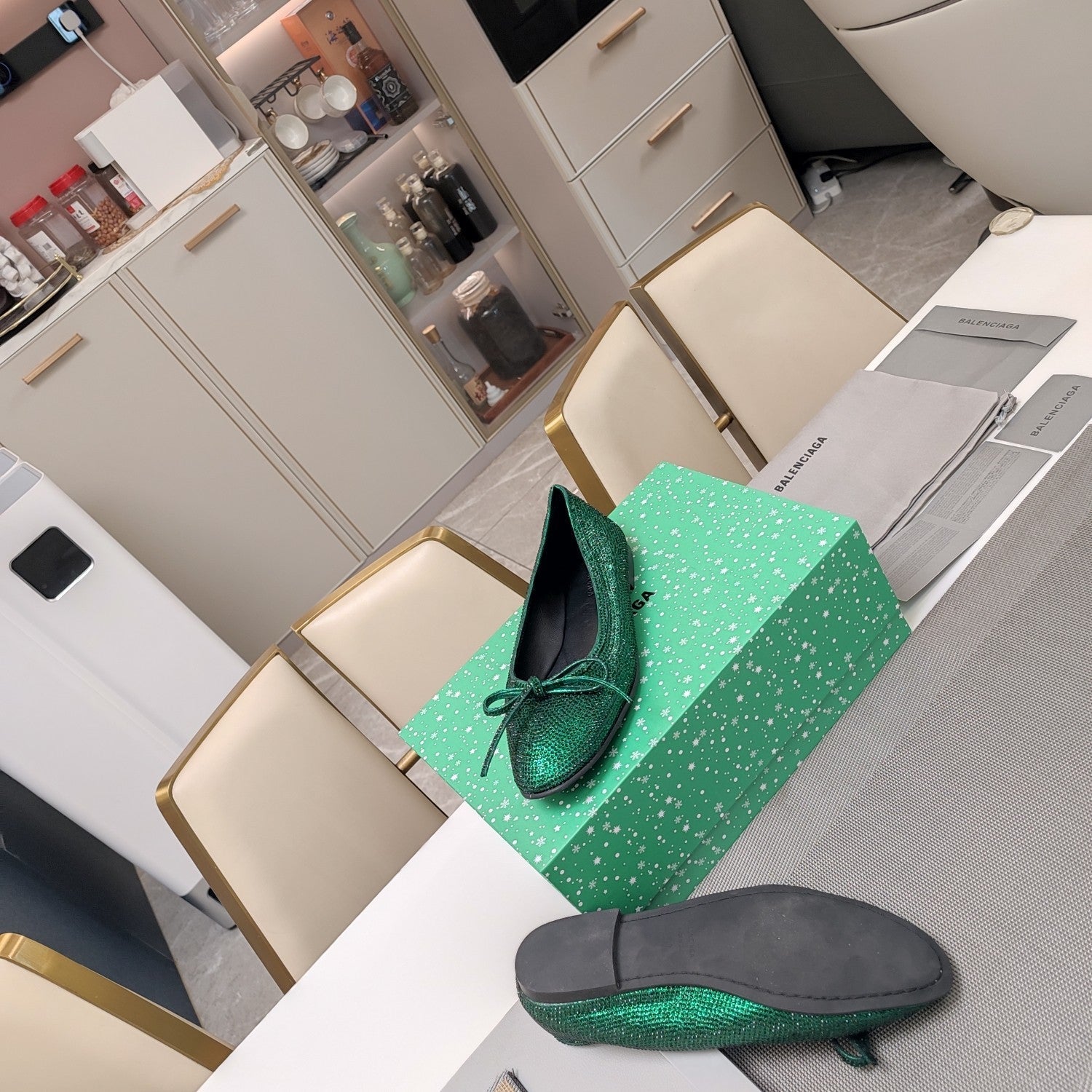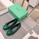 RHINESTONE BALLET FLATS WITH BOW IN FUN GREEN SHEEPSKIN