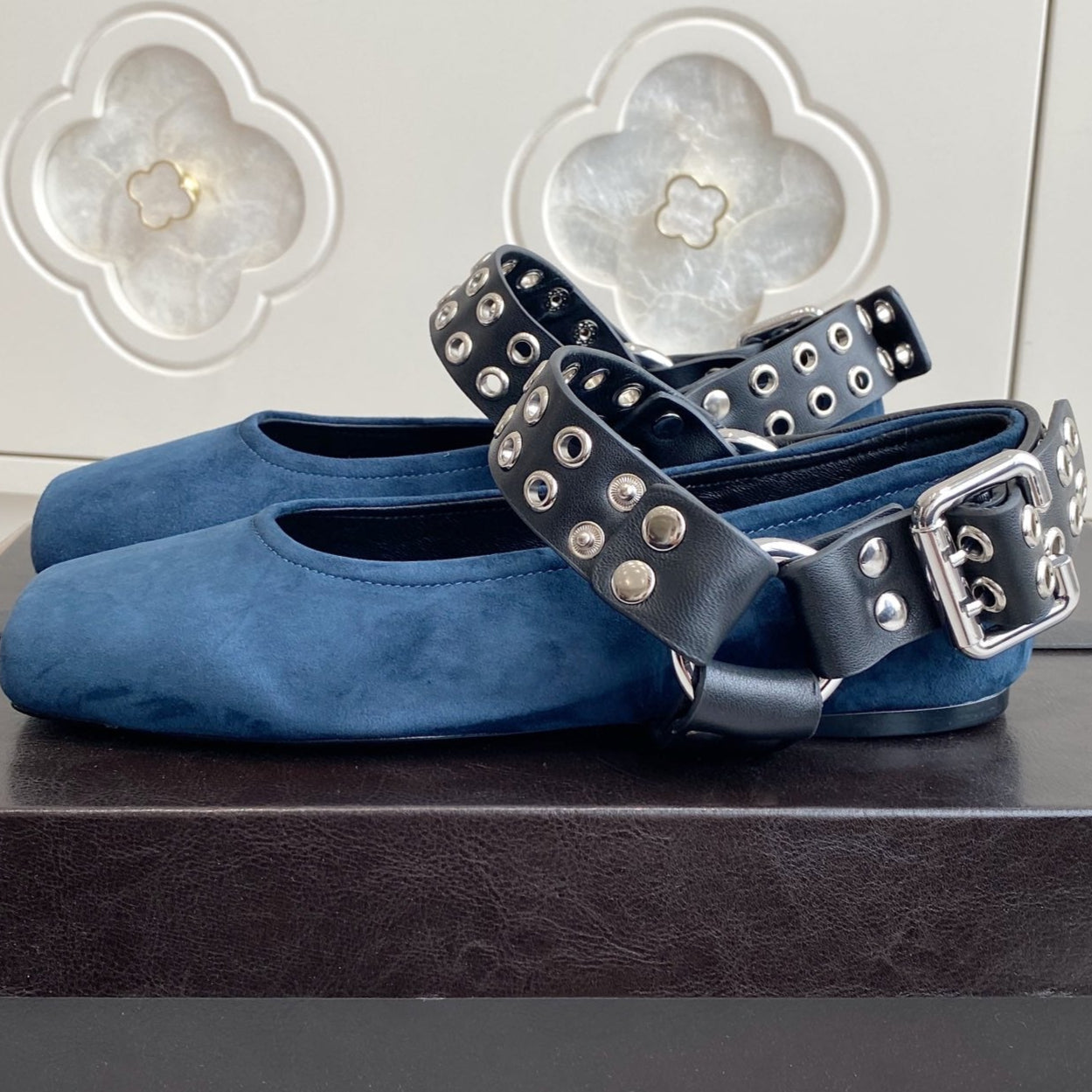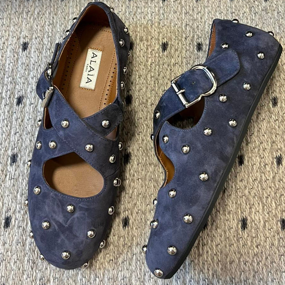 Alaia 25 Criss Cross With Stud Ballet Flats Azure Blue Suede Sheepskin 303691