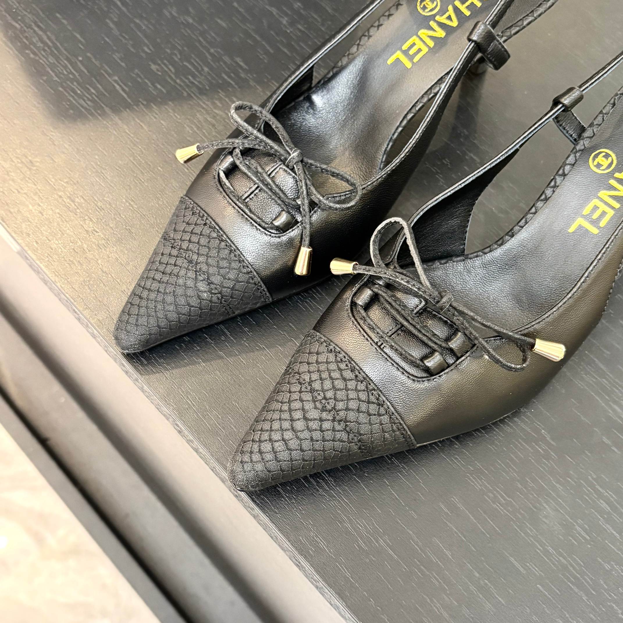 HIGH HEEL SLINGBACKS 65 MM IN BLACK WITH SNAKESKIN PATTERN LAMBSKIN