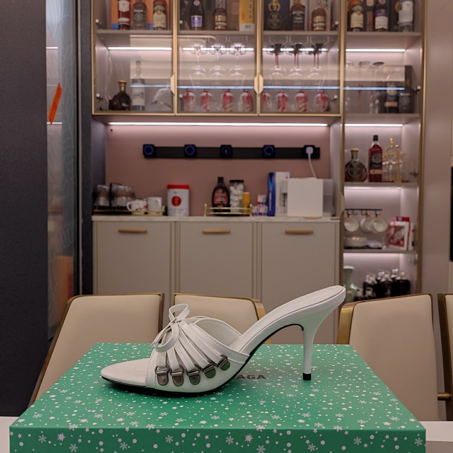 BOW-EMBELLISHED HIGH MULES IN WHITE SHEEPSKIN