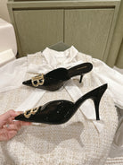POINTED BB GOLD BUCKLE HIGH MULES IN BLACK PATENT CALFSKIN