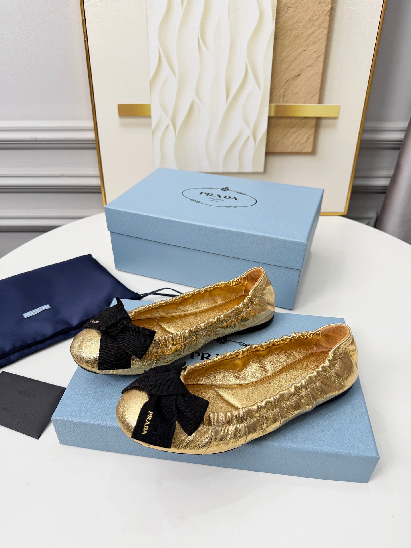 Prada 26s Bow Ballet Flats Gold Metalic Leather 624084