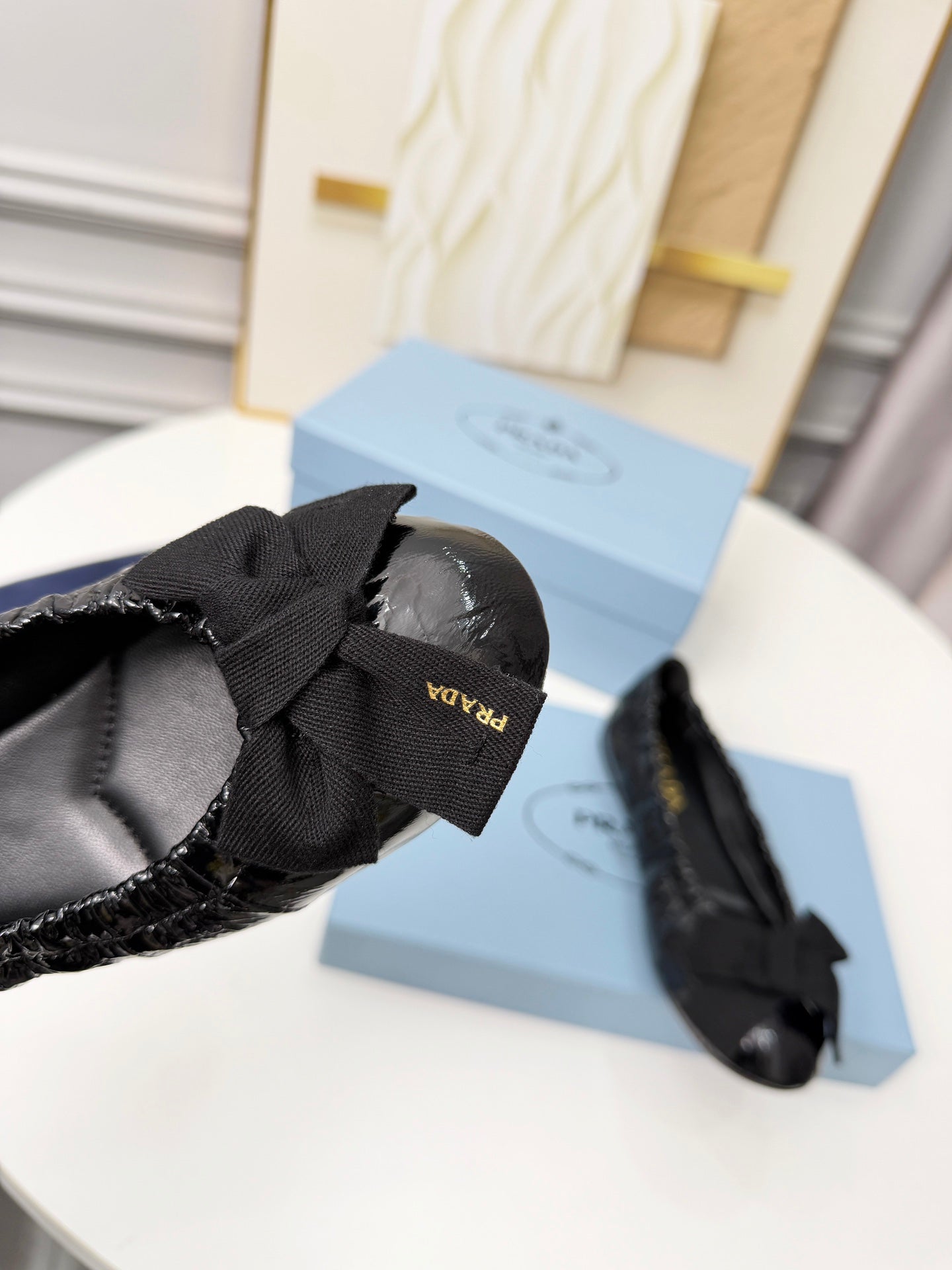 Prada 26s Bow Ballet Flats Black Glossy Leather 624083