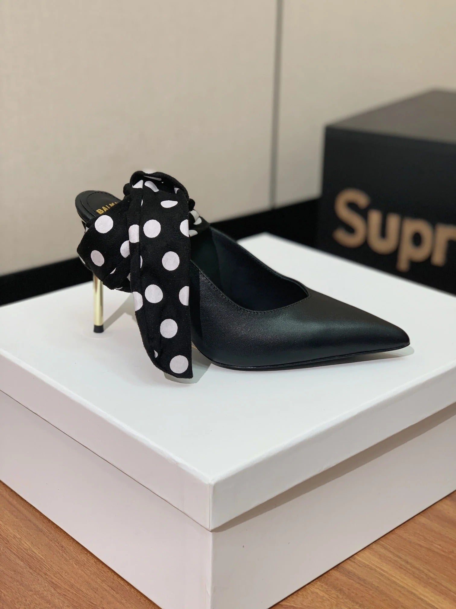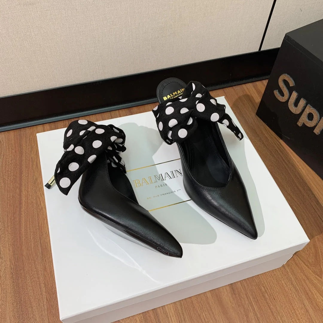 BALMAIN 25S BAKARI MULE WITH MONOCHROME POLKA DOT STRAP 95MM IN BLACK CALFSKIN