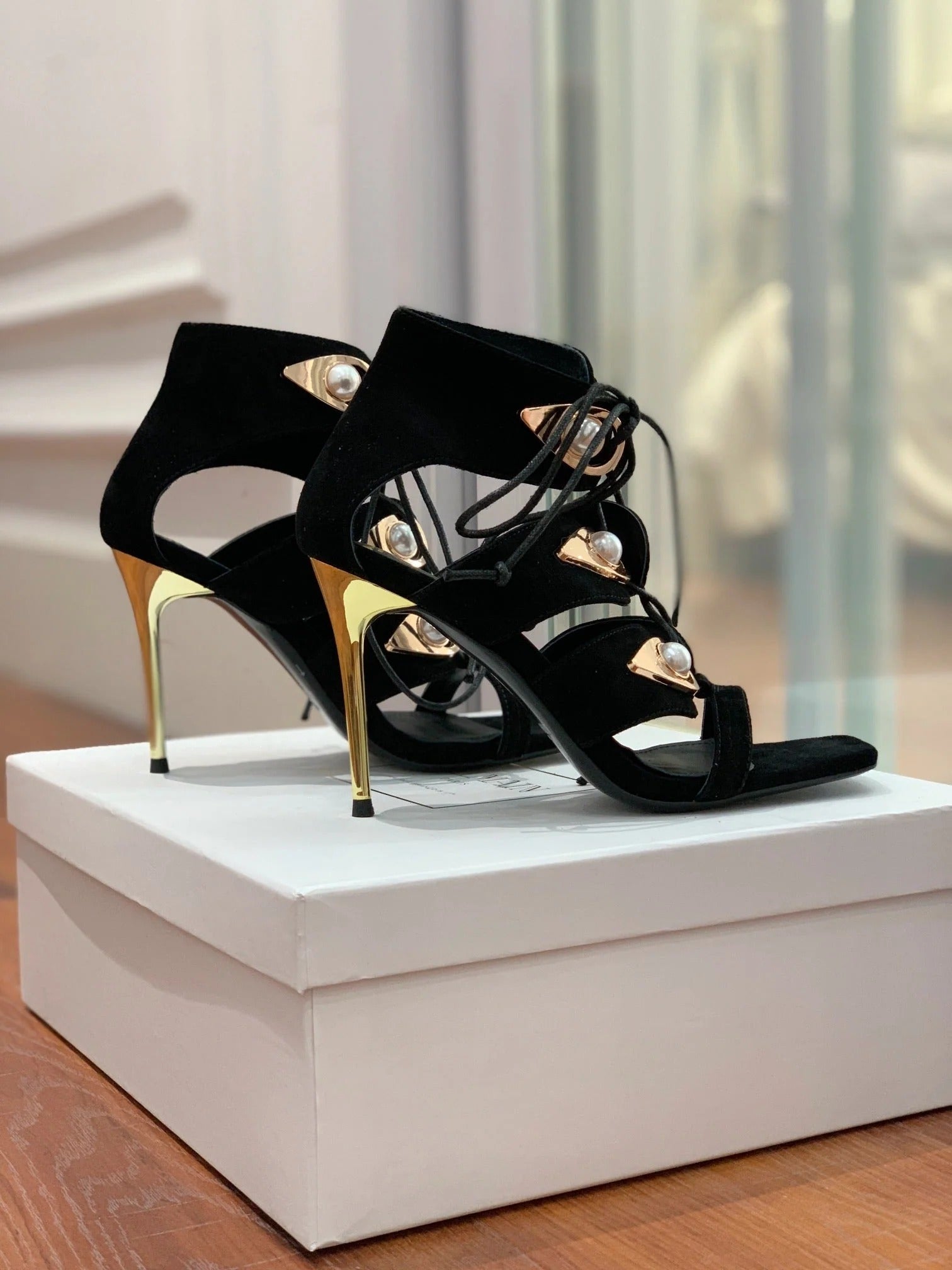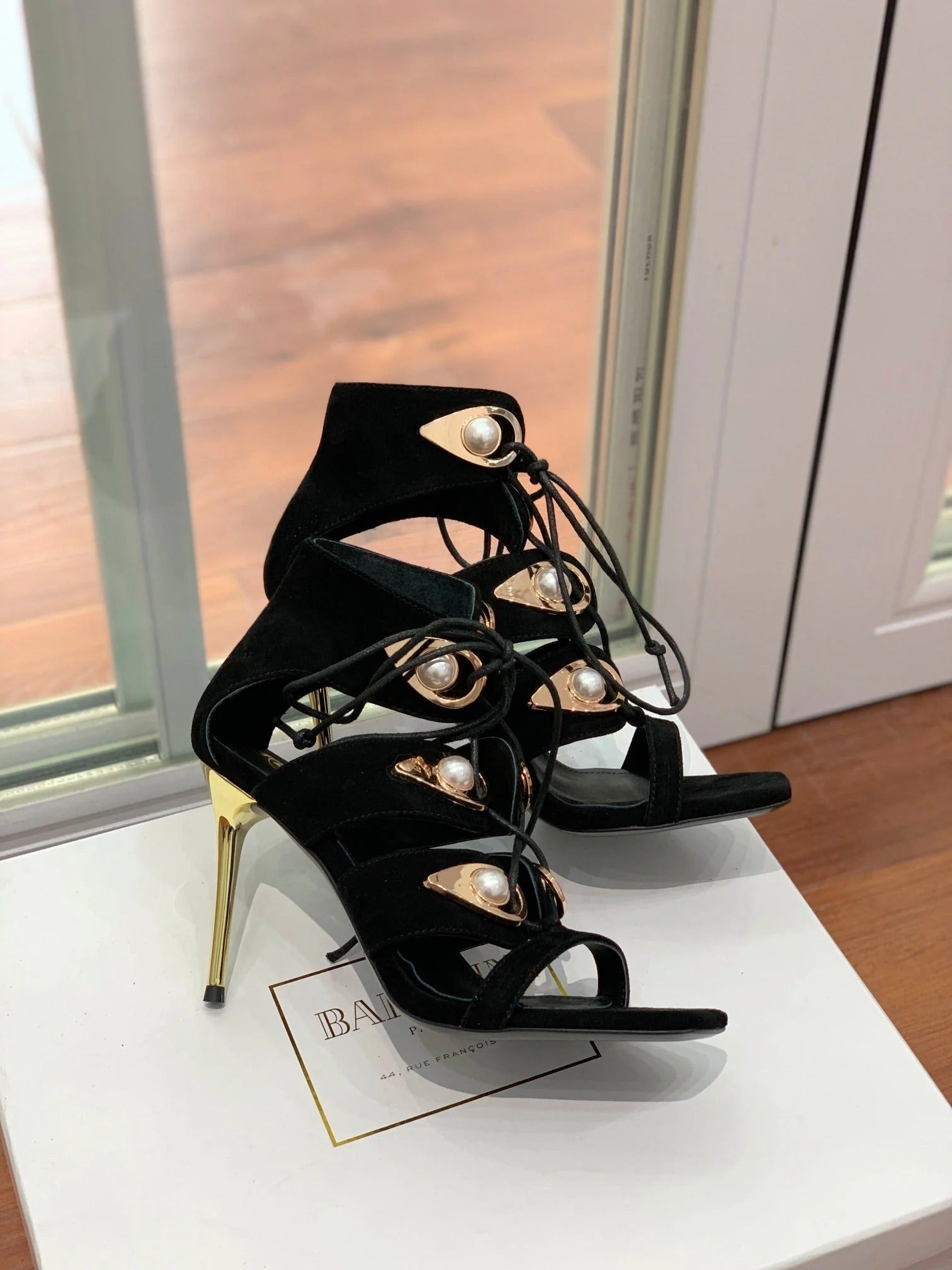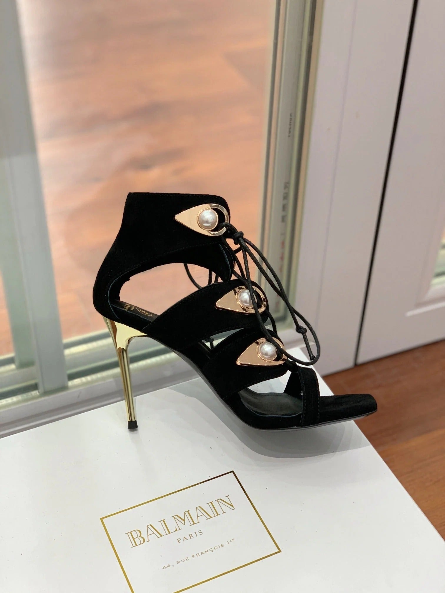 BALMAIN 25S HIGH HEELS 95MM IN BLACK SUEDE WITH PEARL