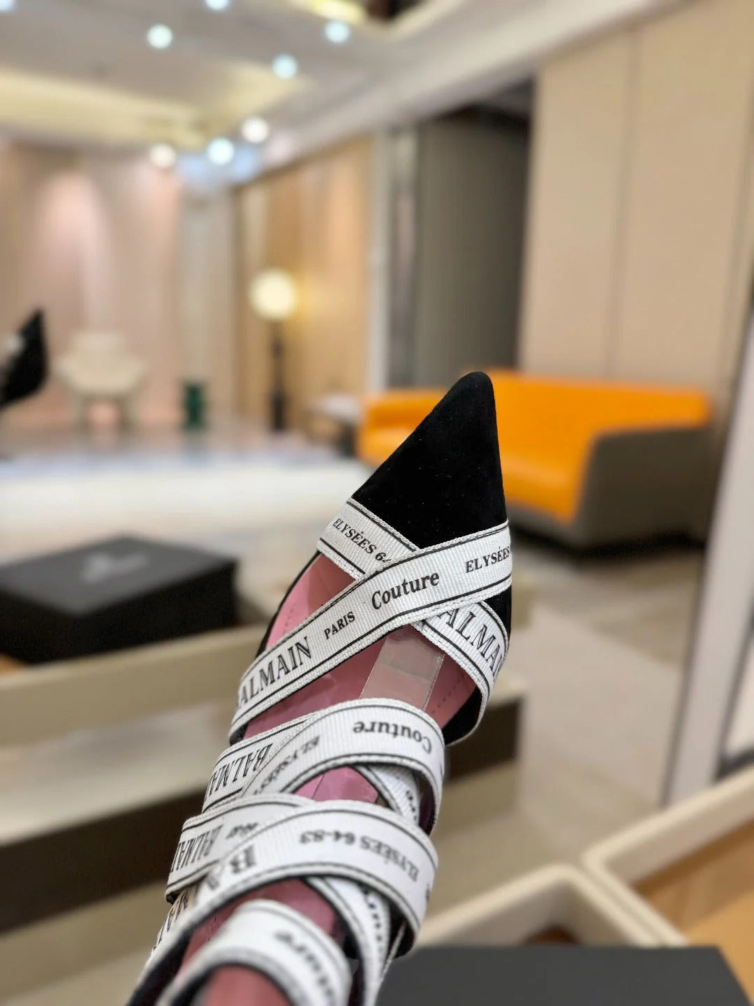 BALMAIN 25S HIGH HEELS LOGO RIBBON 95MM IN BLACK AND WHITE SUEDE