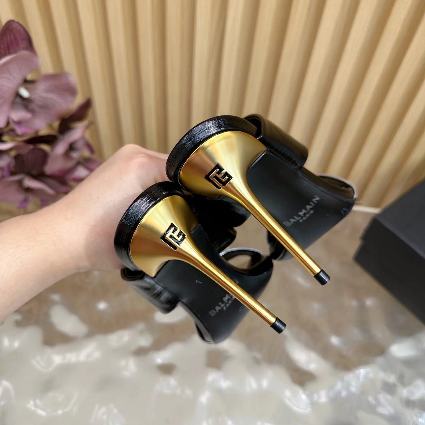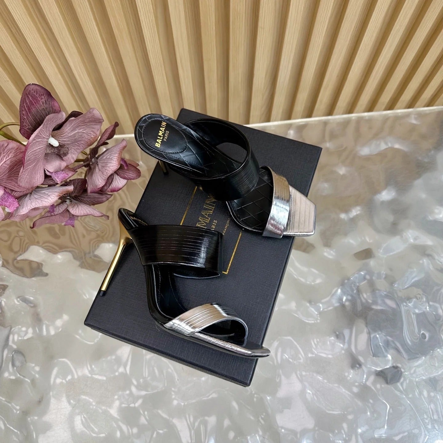 BALMAIN 25S MULES IN STRIPED LEATHER 95MM IN BLACK AND SILVER CALFSKIN