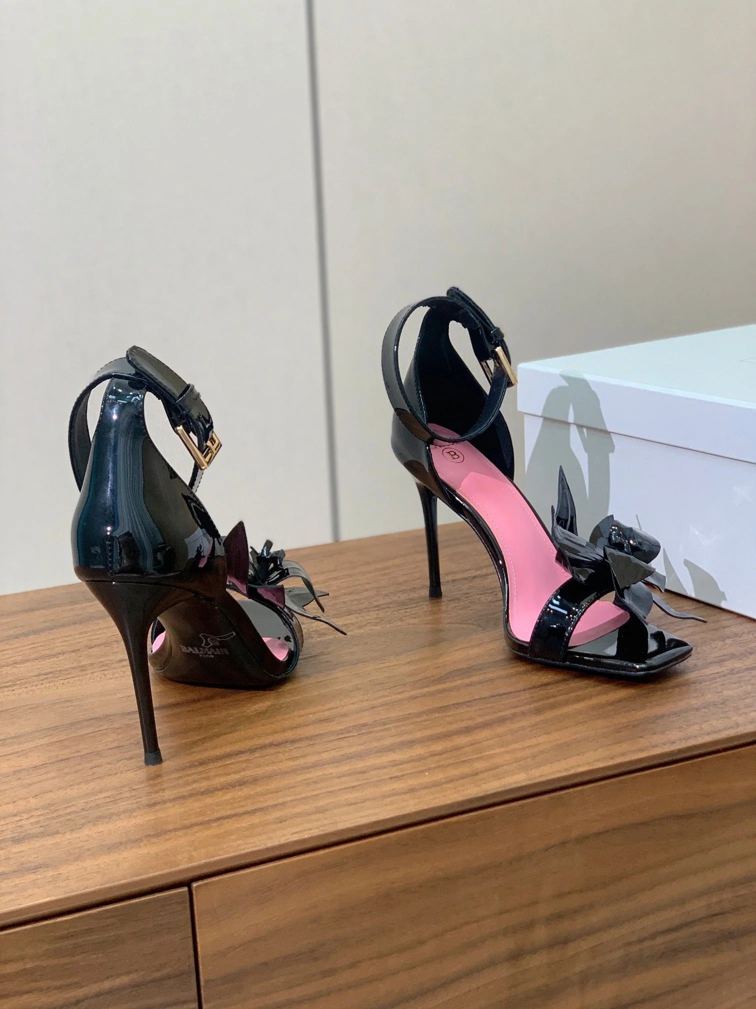 BALMAIN 25S RUBY BLACK HEELED SANDALS 95MM IN PATENT CALFSKIN