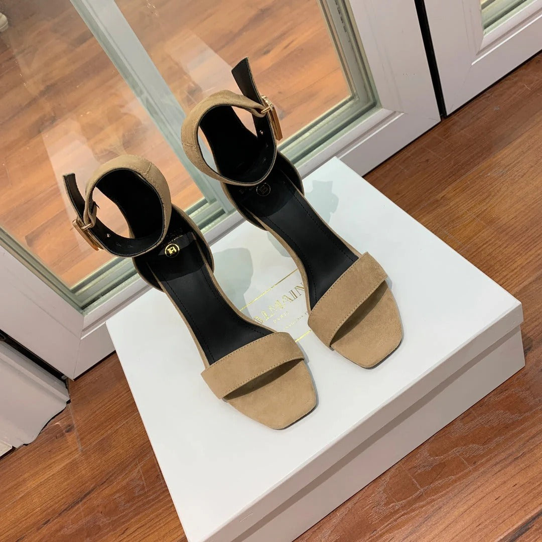 BALMAIN 25S THIN STRAP HIGH HEELS 105MM IN LIGHT MOCHA SUEDE GOLD HARDWARE