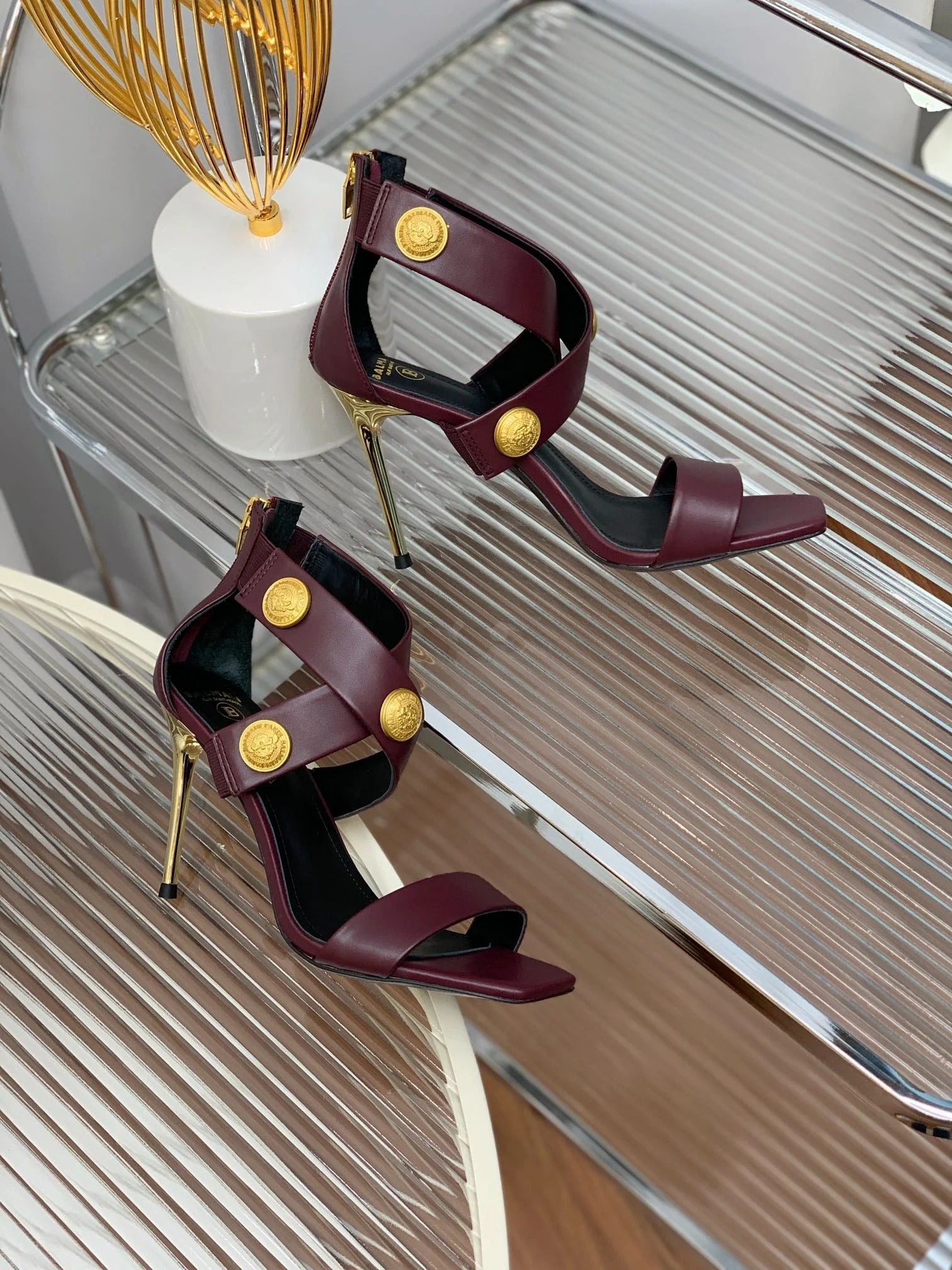 BALMAIN 25S THIN STRAP HIGH HEELS 105MM IN DARK RED SUEDE GOLD HARDWARE