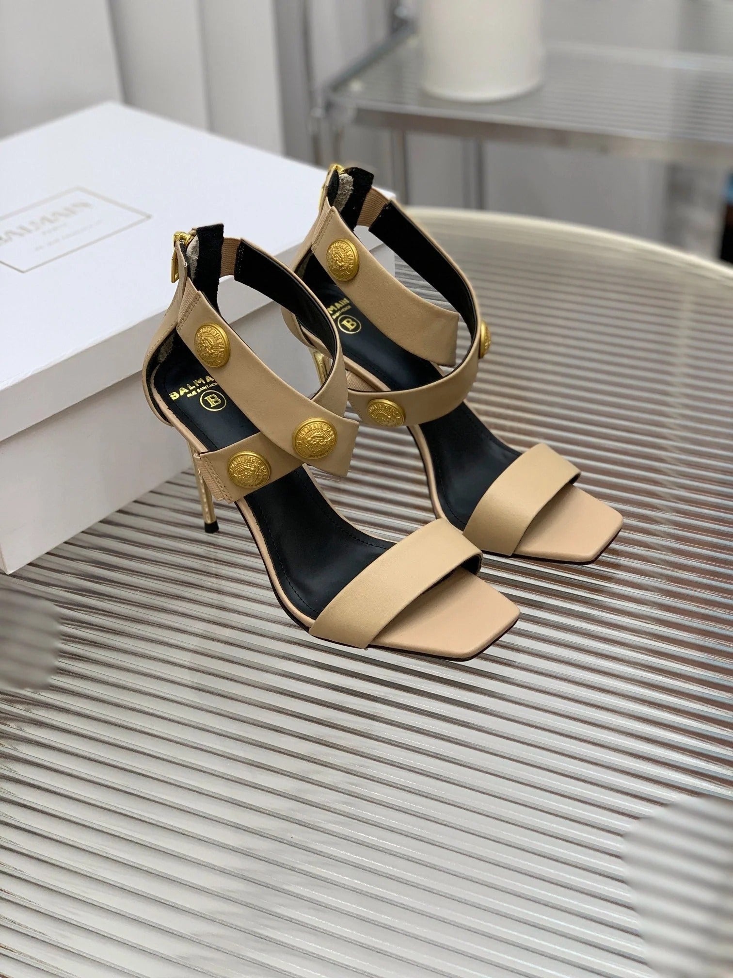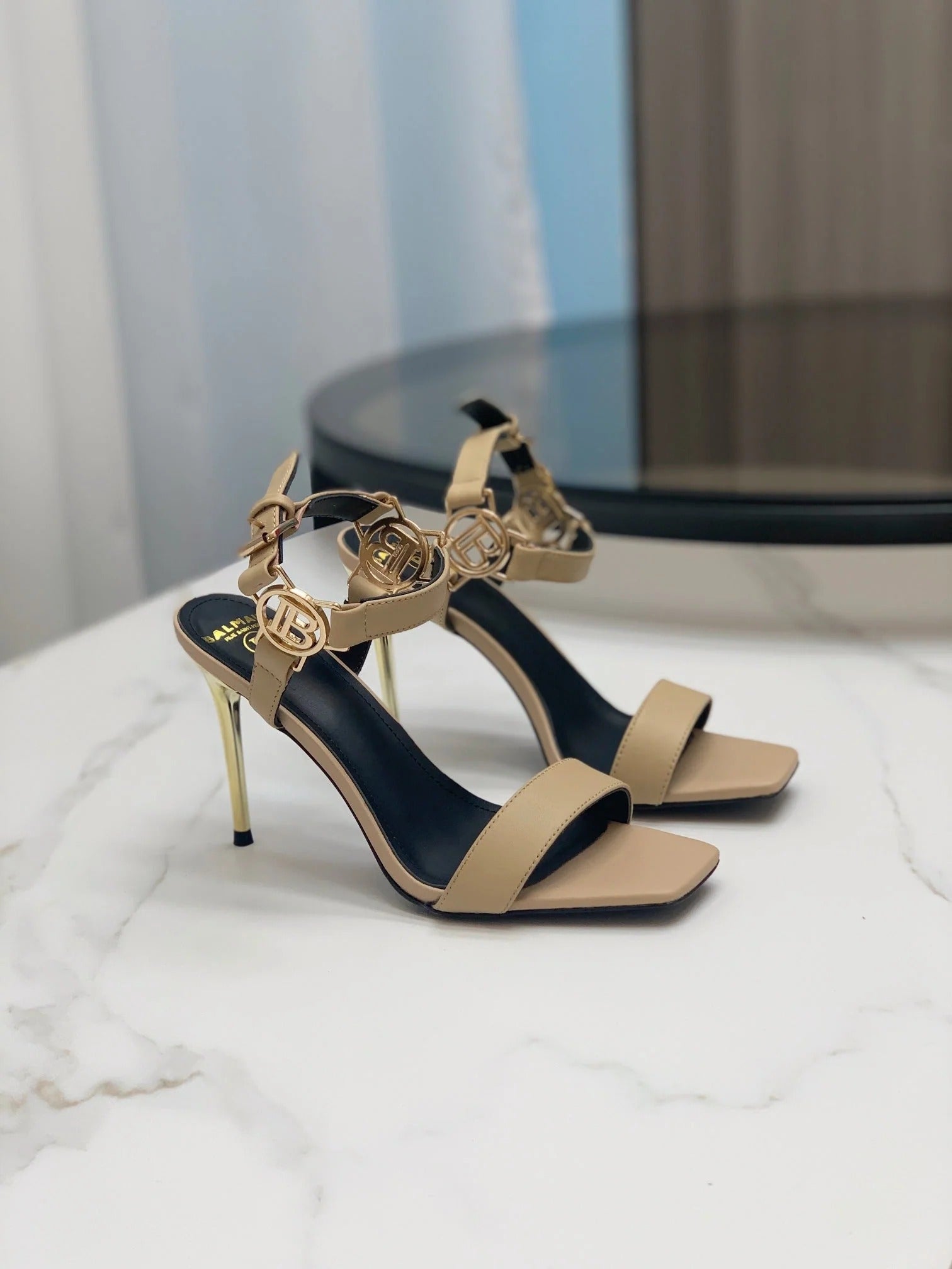 BALMAIN 25S MONETA SANDAL 95MM IN WARM BEIGE CALFSKIN