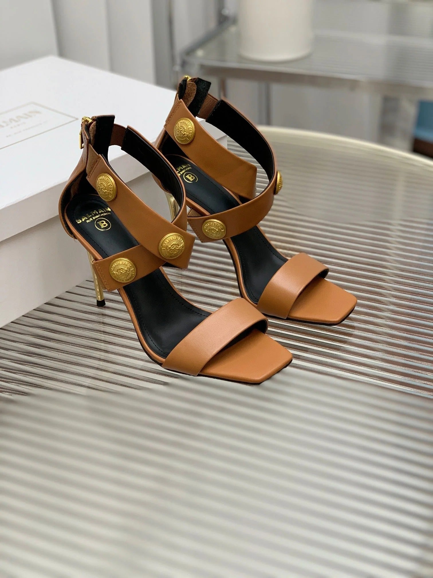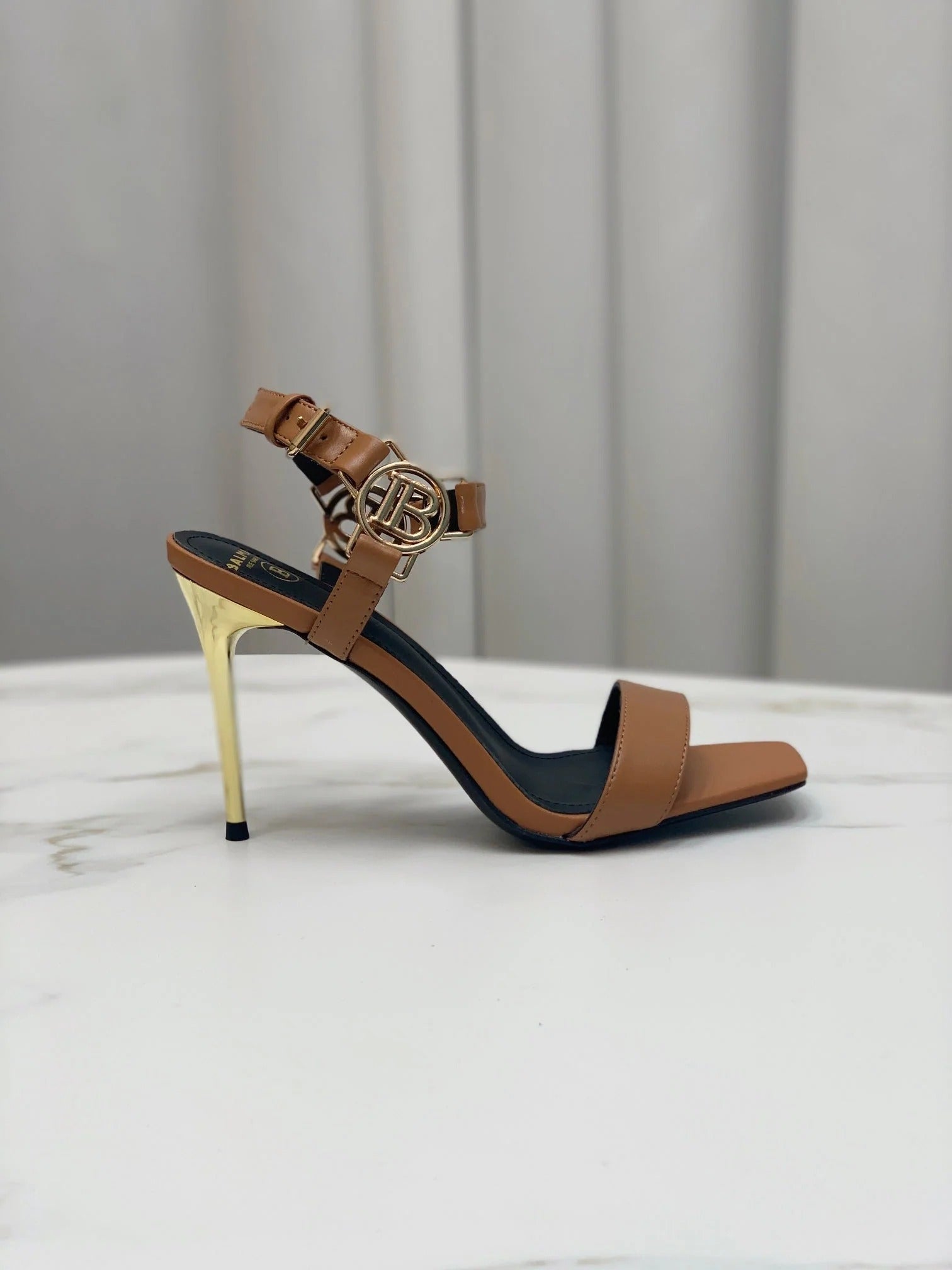 BALMAIN 25S CROSSOVER STRAP HIGH HEELS 95MM IN BROWN CALFSKIN