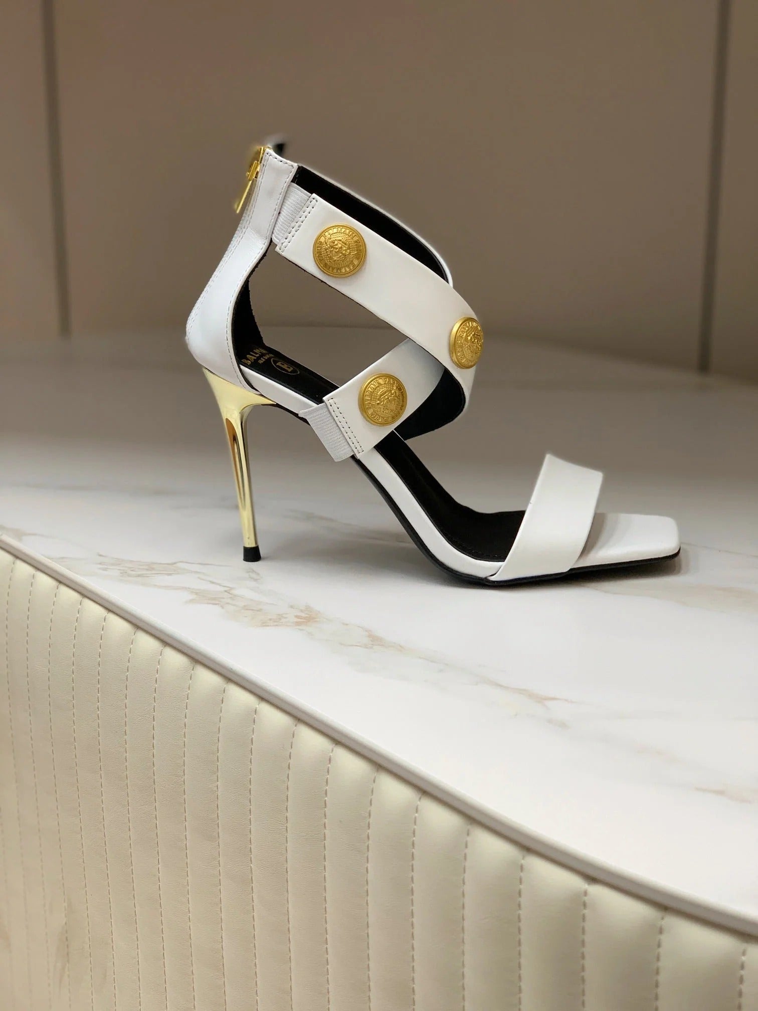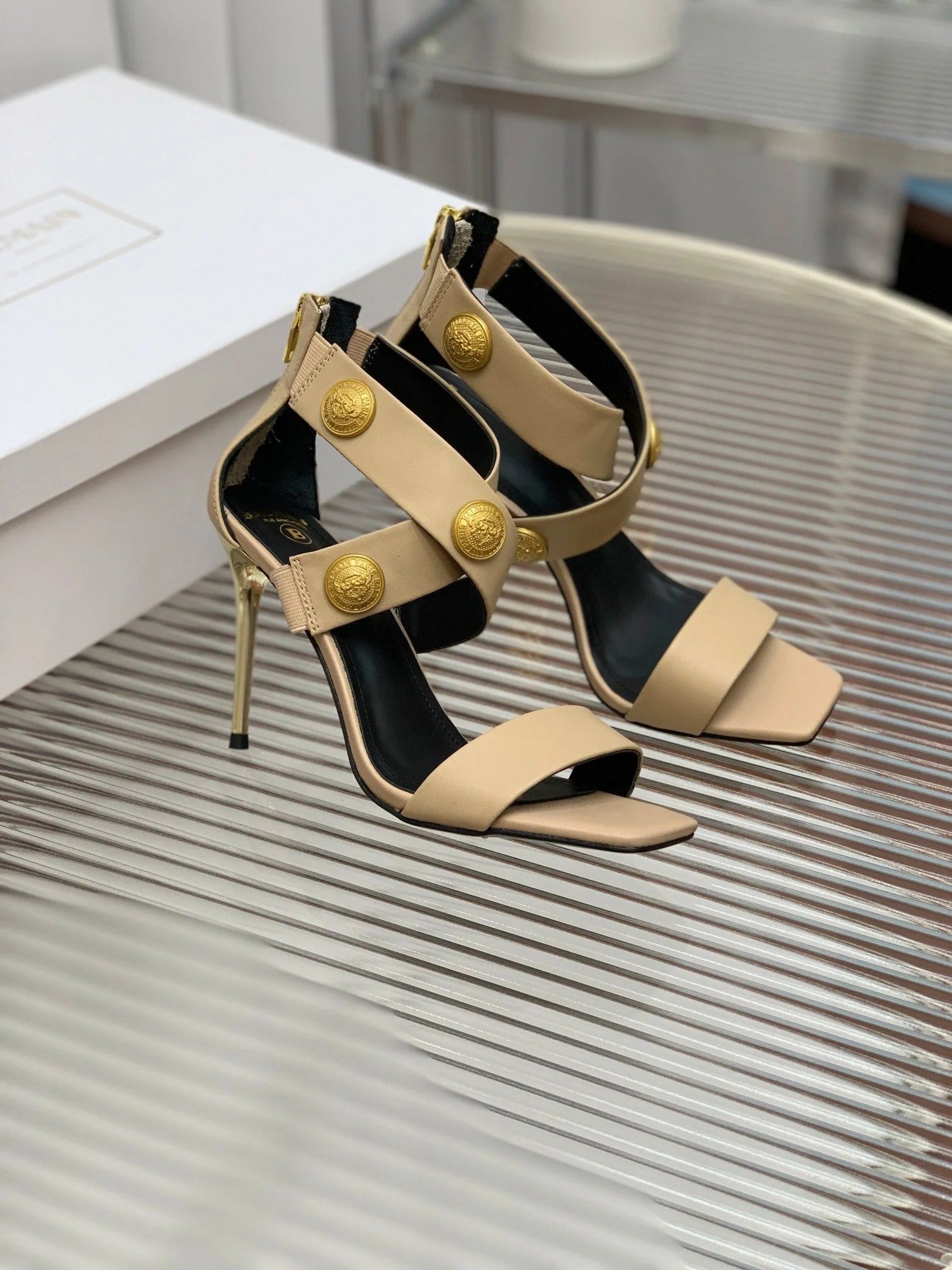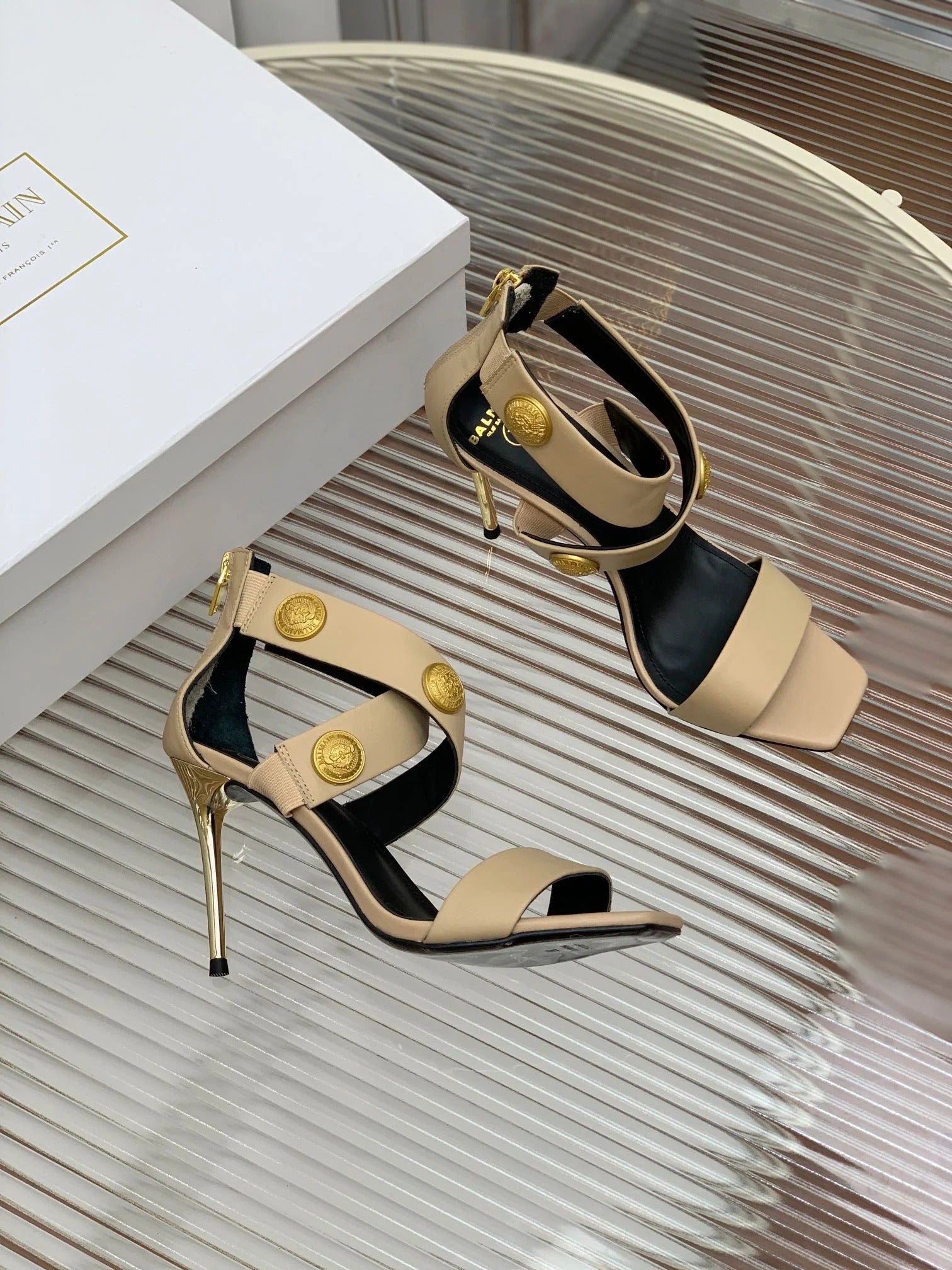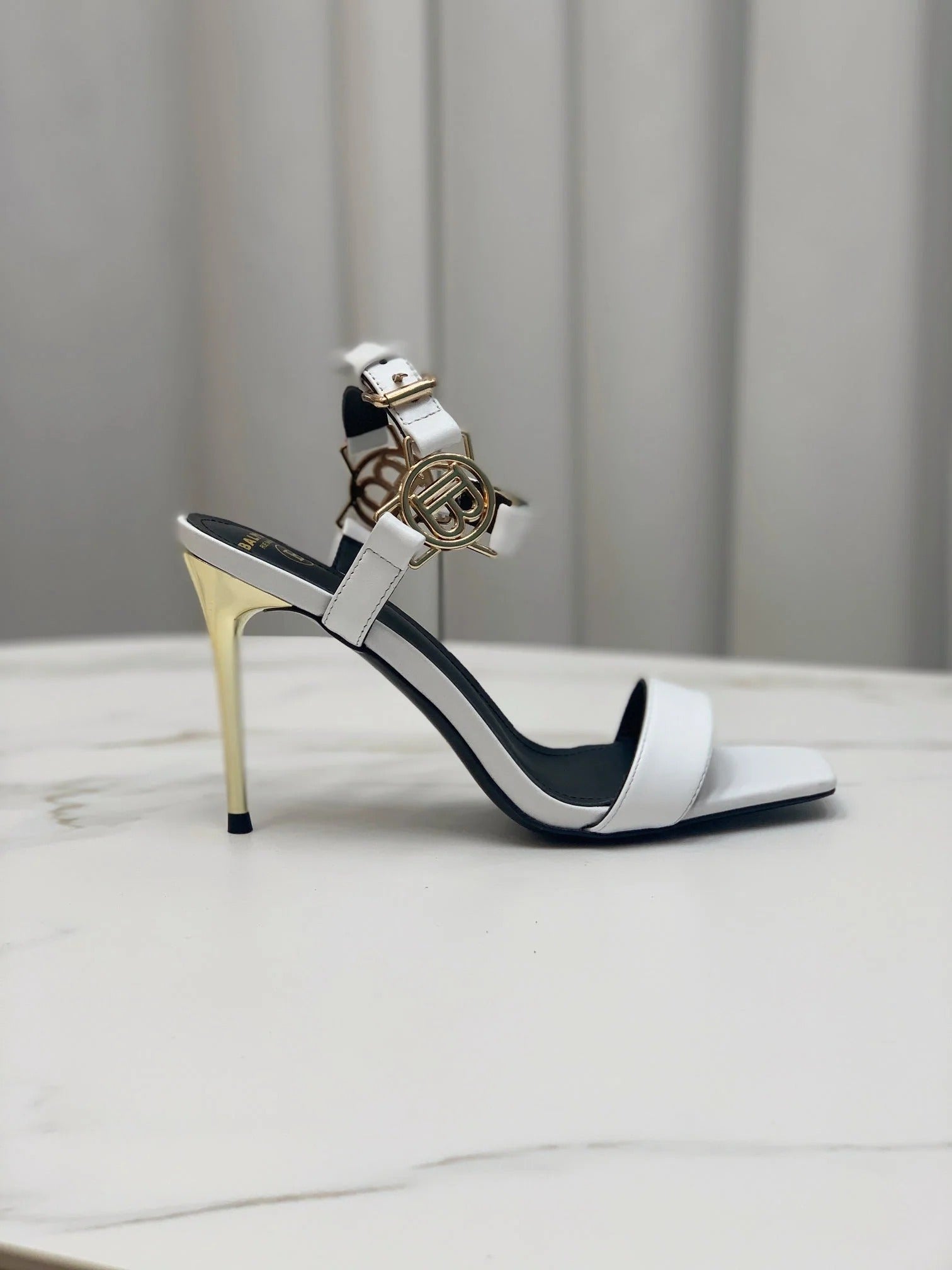 BALMAIN 25S B STRAP HIGH HEEL SANDALS 95MM IN GOLD CALFSKIN