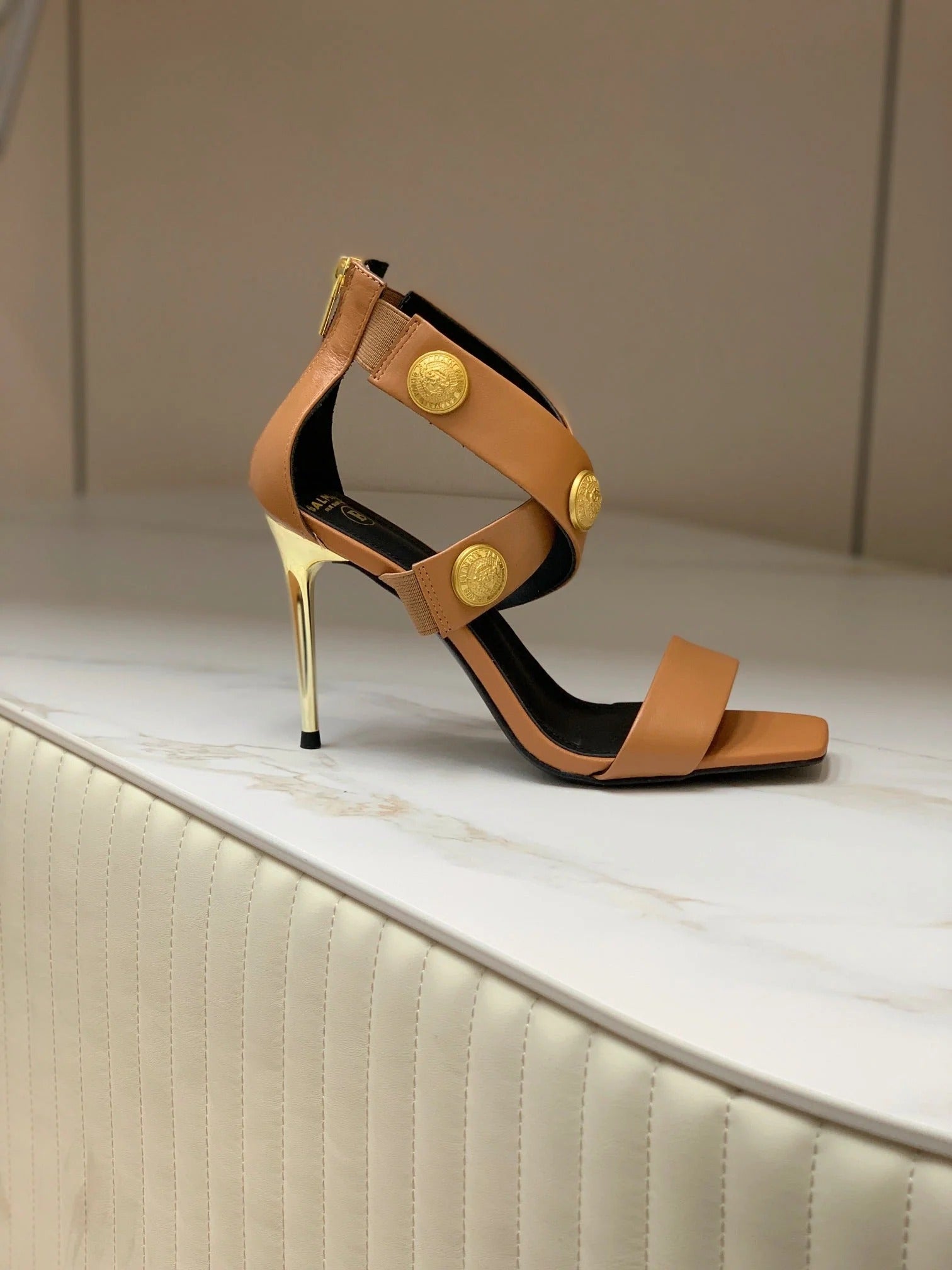 BALMAIN 25S CROSSOVER STRAP HIGH HEELS 95MM IN LIGHT BROWN CALFSKIN