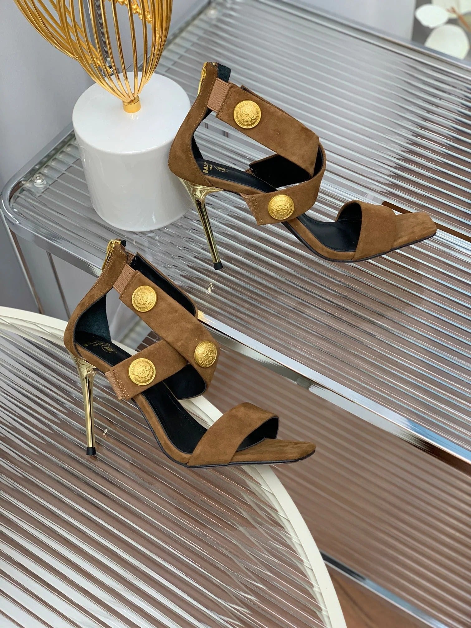 BALMAIN 25S THIN STRAP HIGH HEELS 105MM IN DARK BROWN SUEDE GOLD HARDWARE
