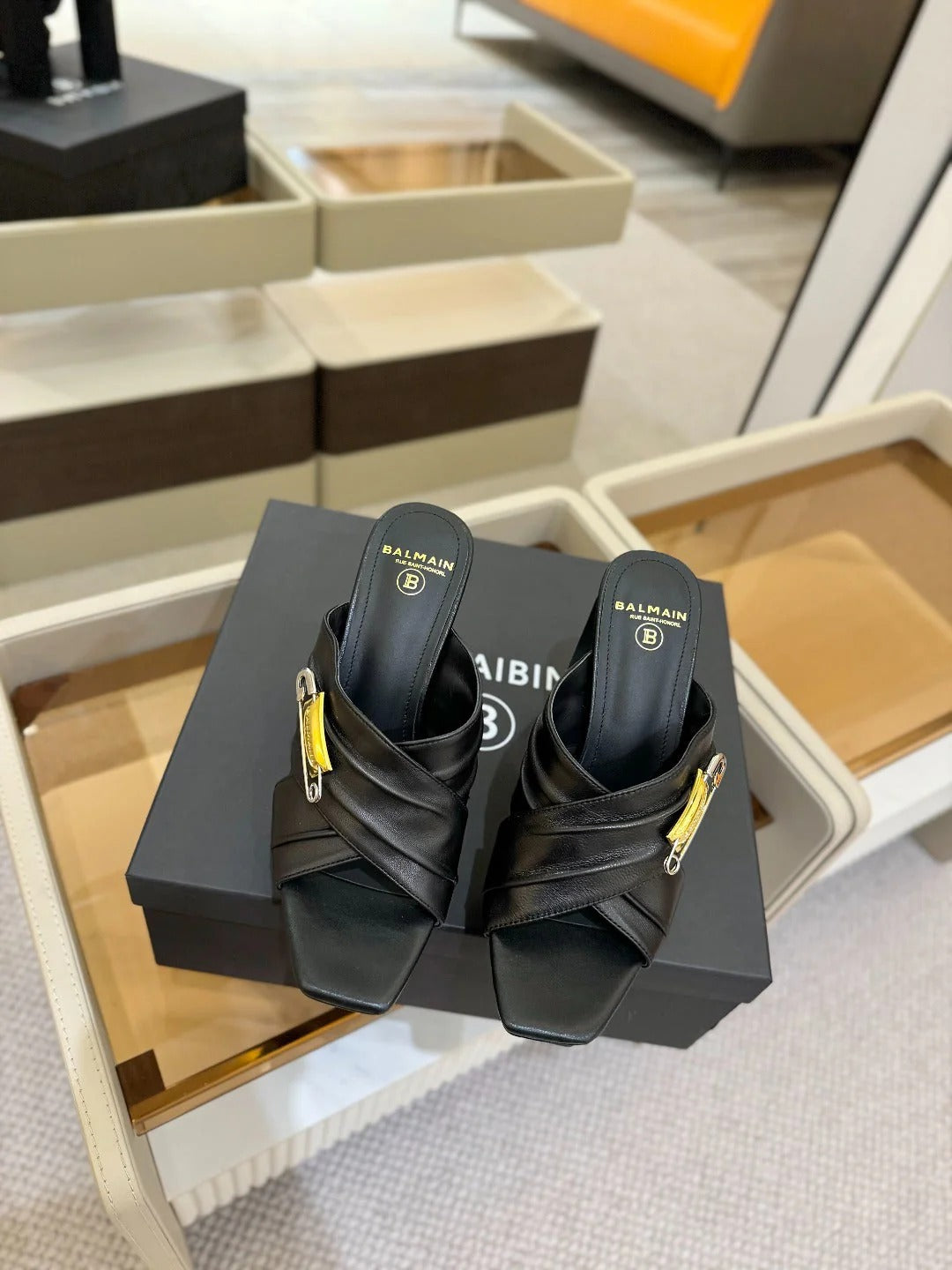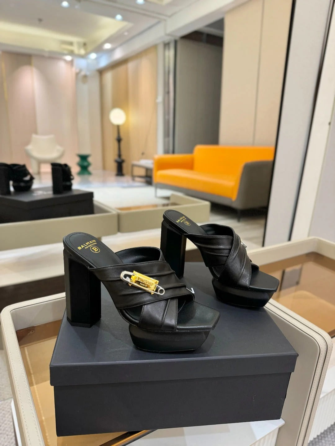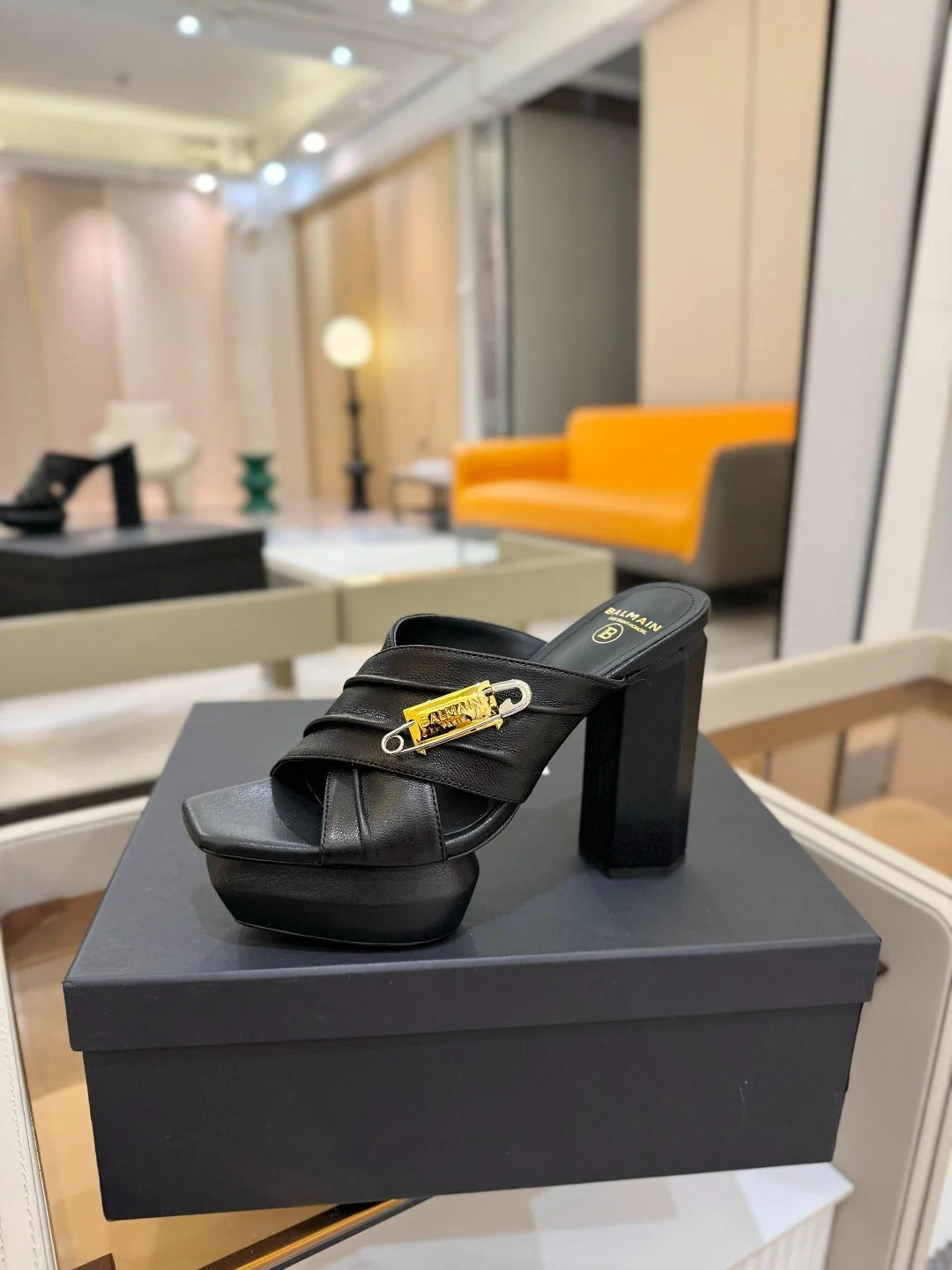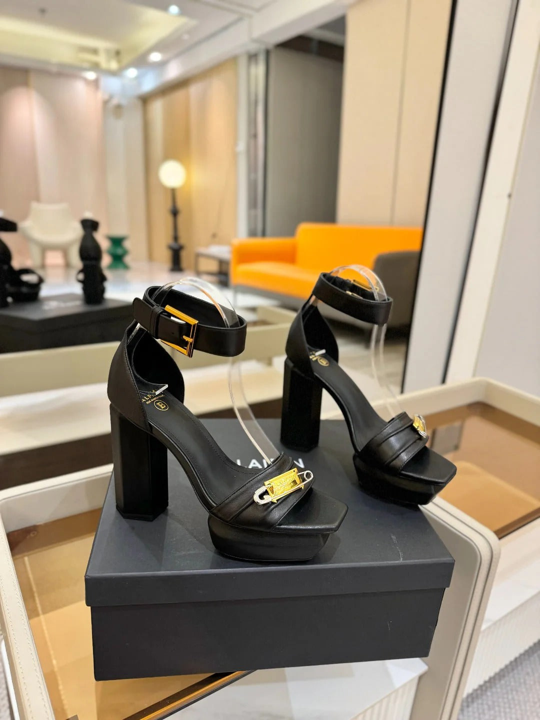 BALMAIN 25S SQUARE STRAP HIGH HEELS 100MM IN BLACK CALFSKIN