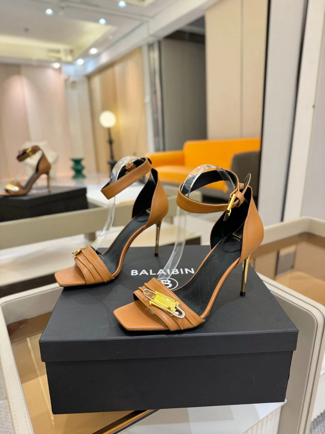BALMAIN 25S HIGH HEEL SANDALS 95MM IN BROWN CALFSKIN