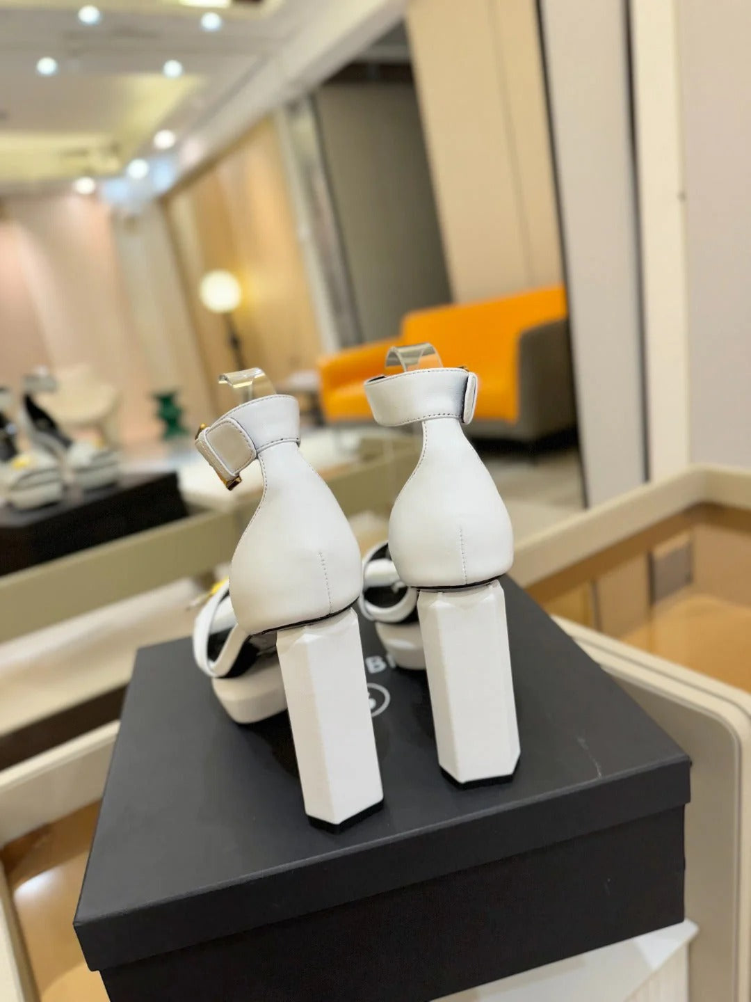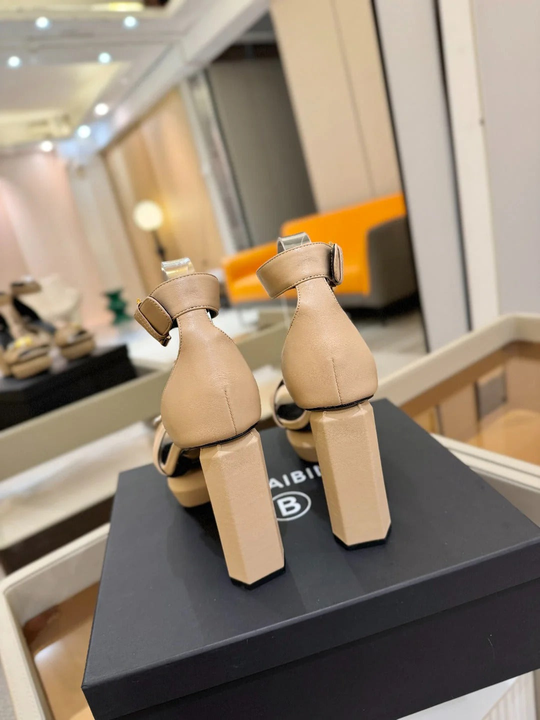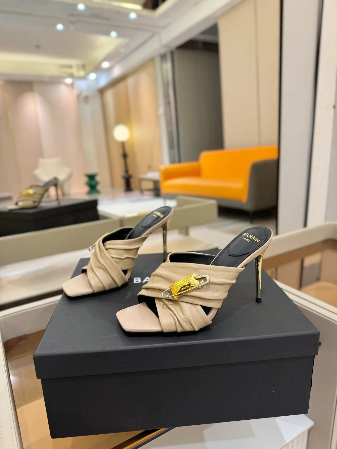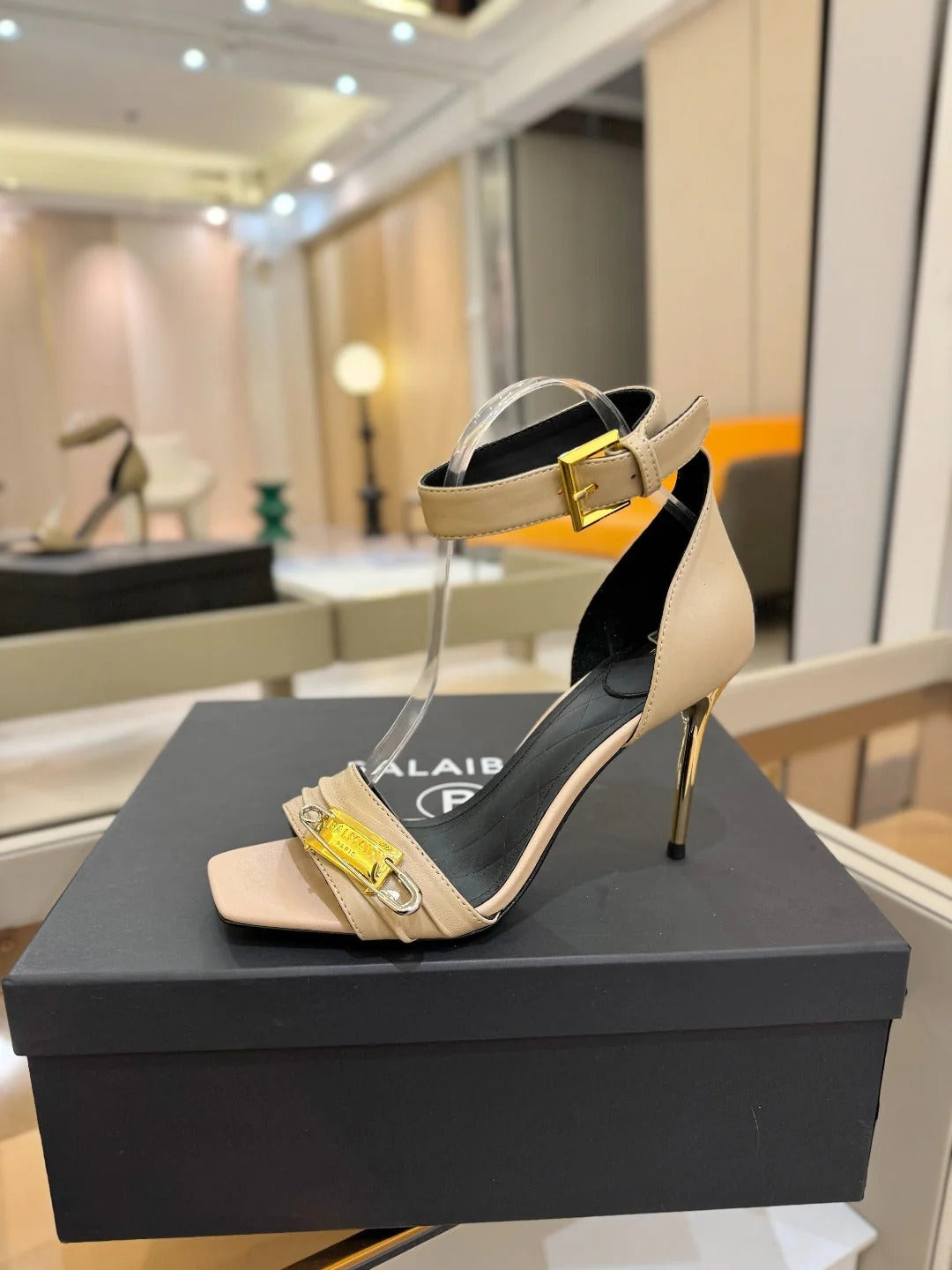 BALMAIN 25S SQUARE STRAP HIGH HEELS 100MM IN BEIGE GRAY CALFSKIN