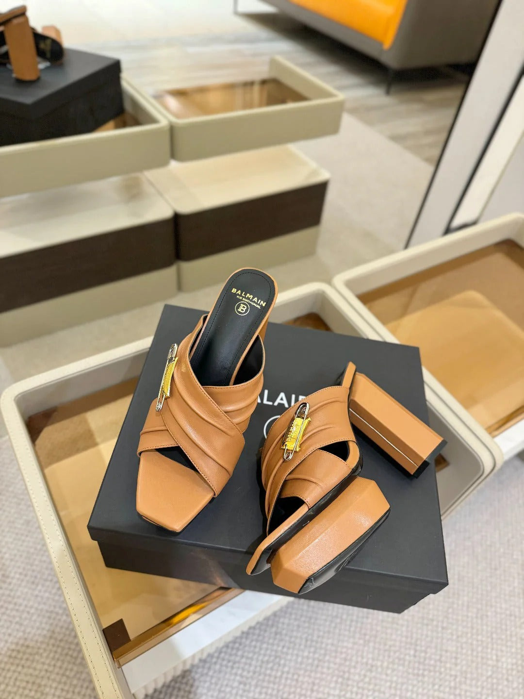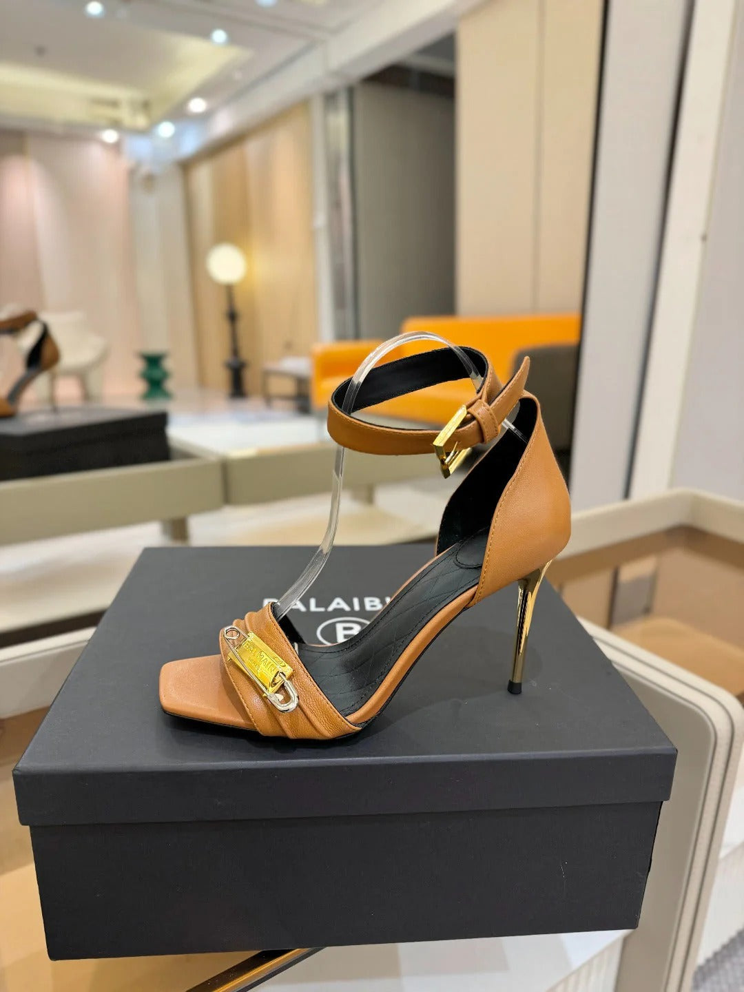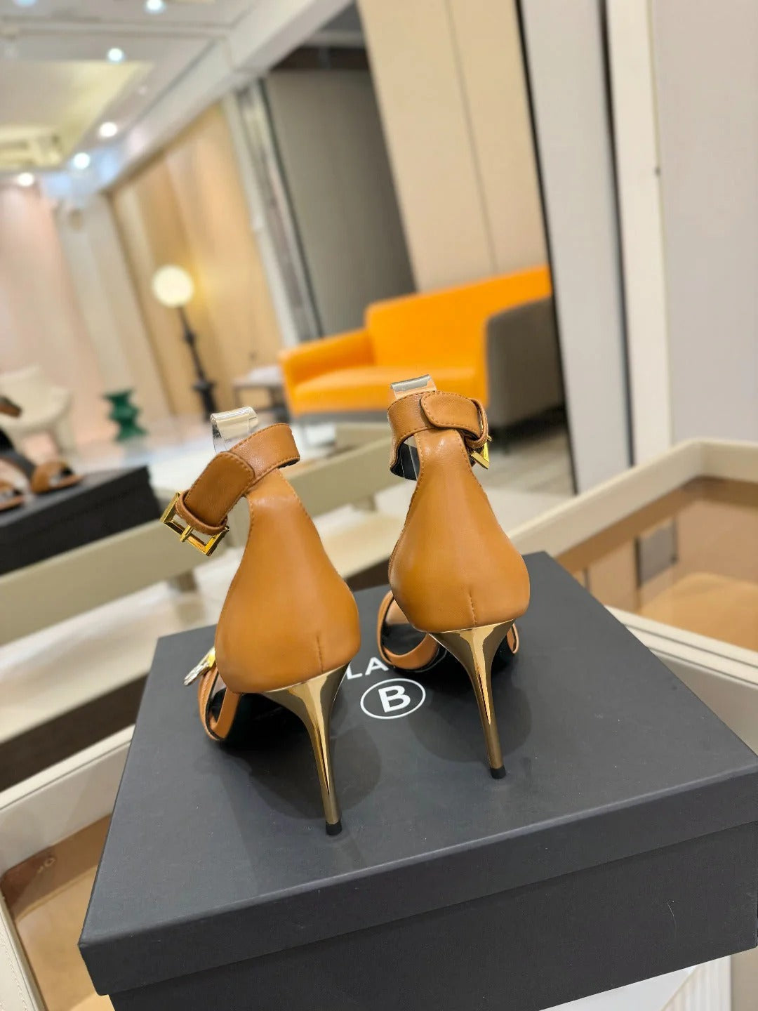 BALMAIN 25S SQUARE STRAP HIGH HEELS 100MM IN CARAMEL CALFSKIN
