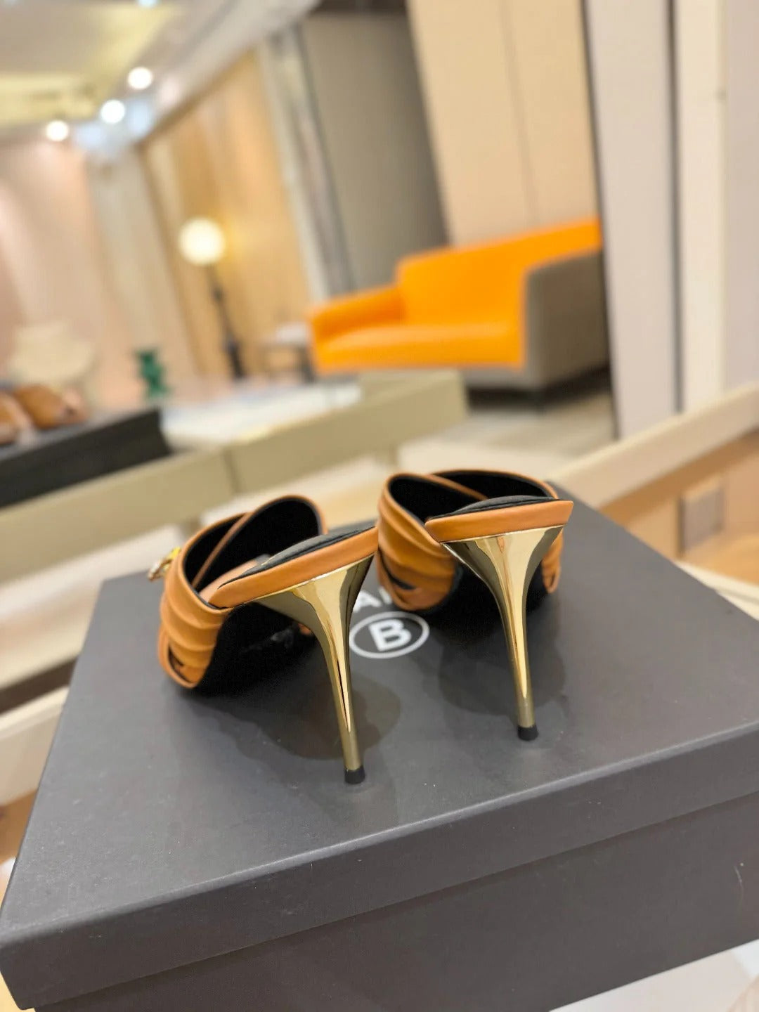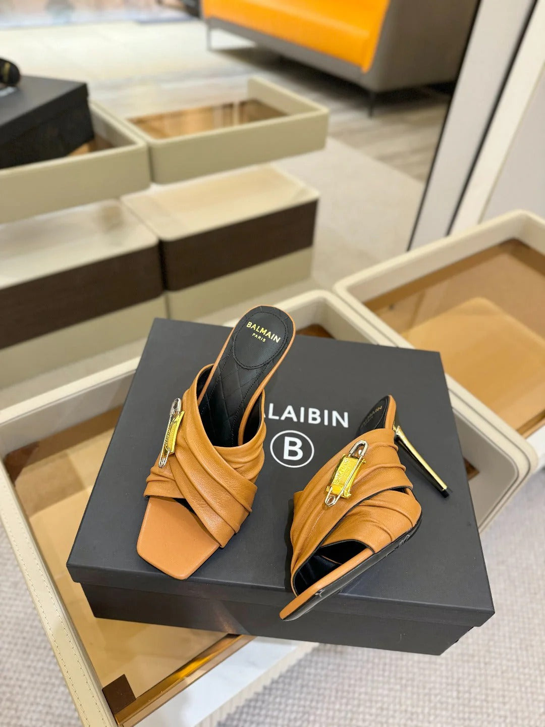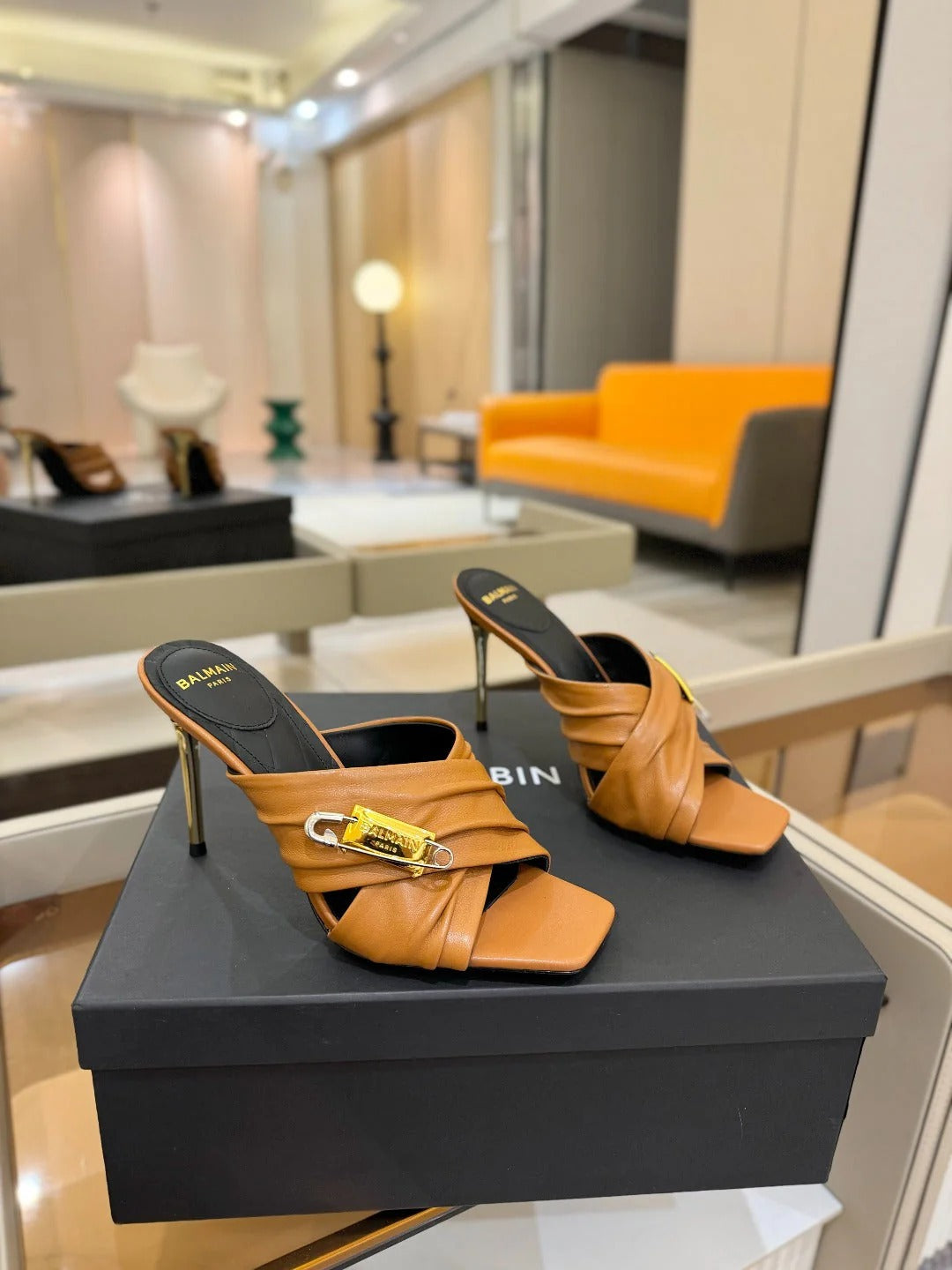 BALMAIN 25S SQUARE STRAP HIGH HEELS 100MM IN CARAMEL CALFSKIN