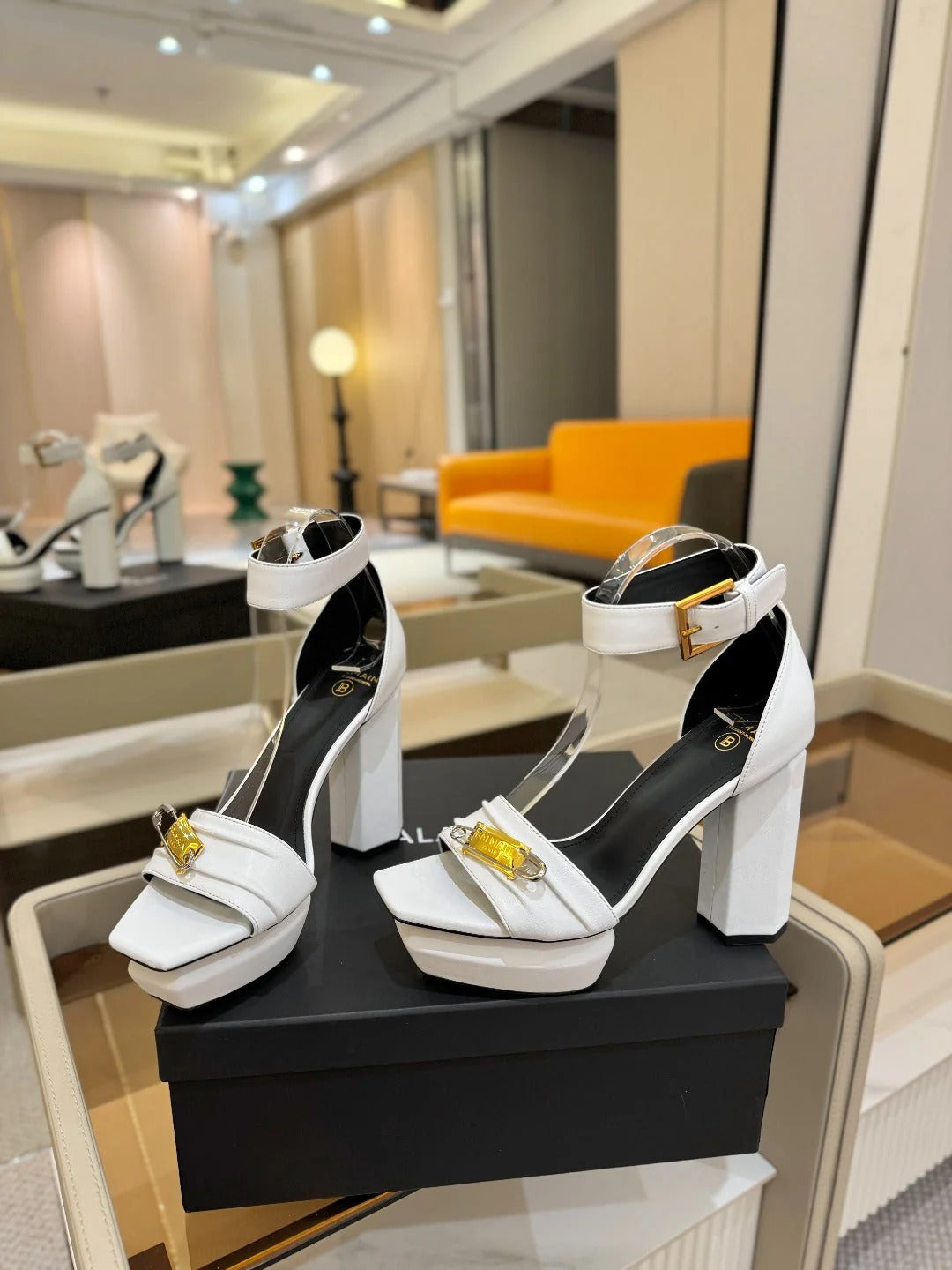 BALMAIN 25S SQUARE STRAP HIGH HEELS 100MM IN SILVER CALFSKIN