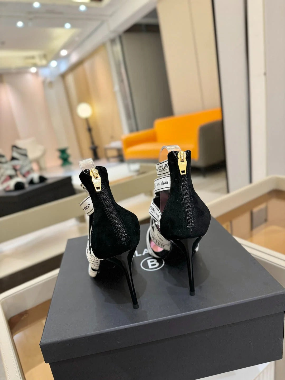 BALMAIN 25S HIGH HEELS LOGO RIBBON 95MM IN BLACK AND WHITE SUEDE