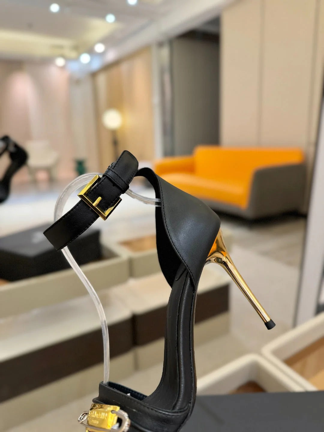 BALMAIN 25S THIN STRAP HIGH HEELS 105MM IN BLACK CALFSKIN GOLD HARDWARE