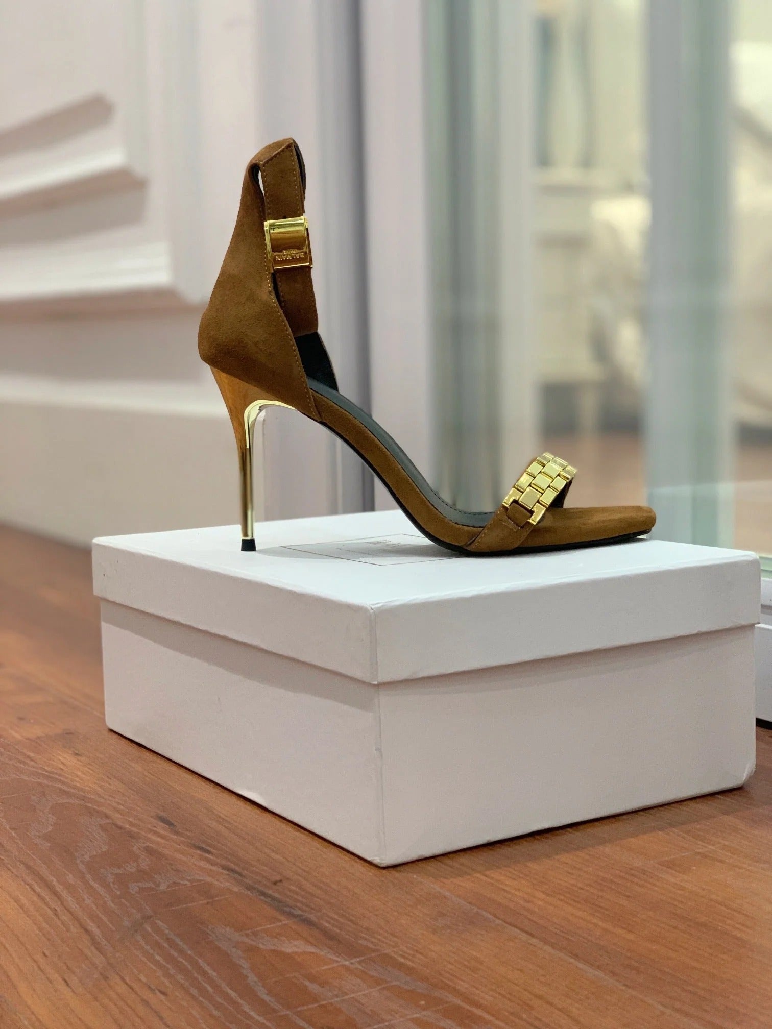 BALMAIN 25S METAL STRAP HIGH HEELS 95MM IN LIGHT BROWN SUEDE GOLD HARDWARE