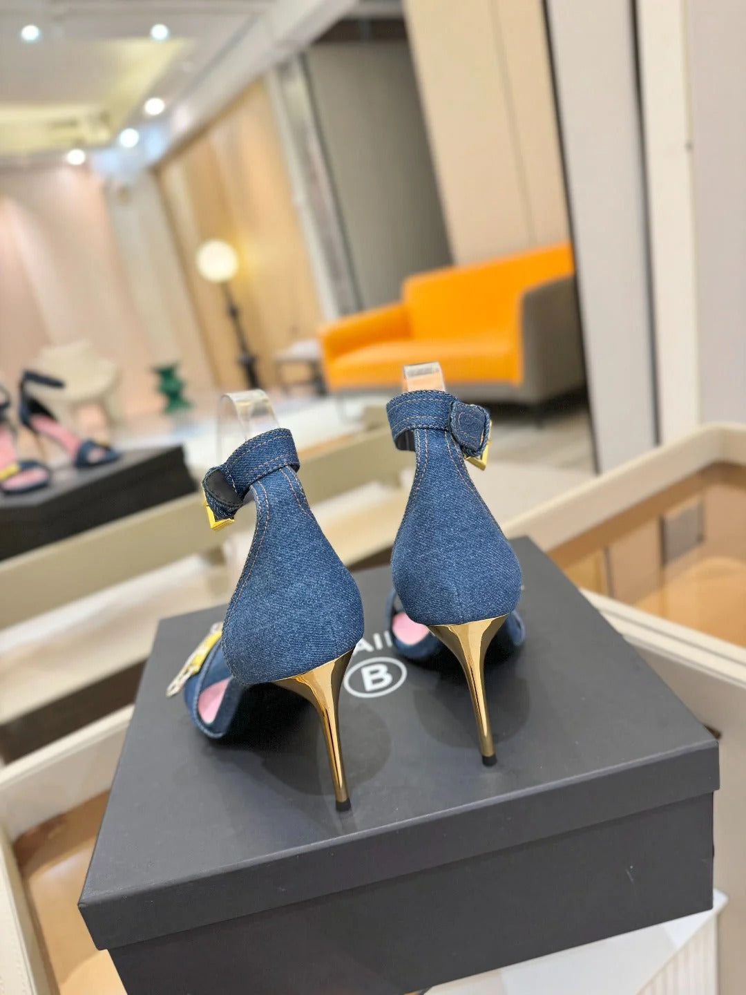 BALMAIN 25S HIGH HEELS 95MM IN BLUE DENIM