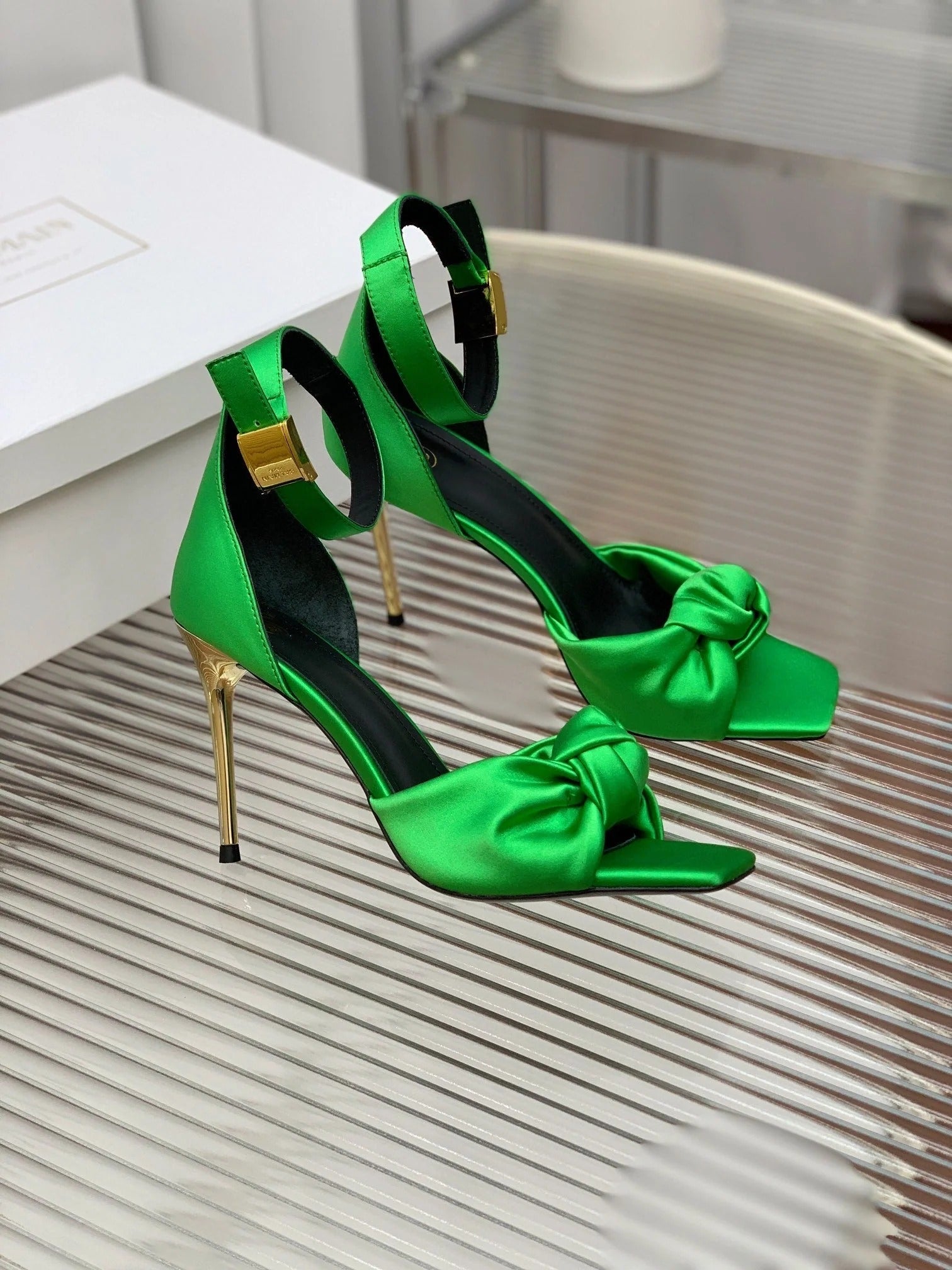 BALMAIN 25S KNOTTED HIGH HEELS 95MM IN KELLY GREEN SATIN