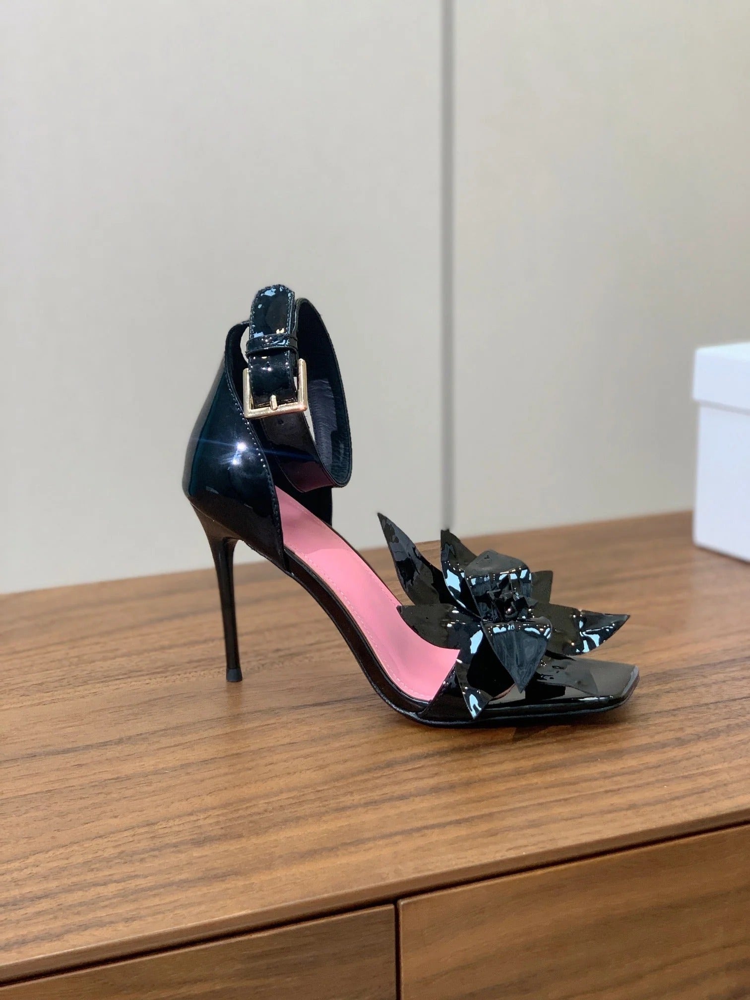 BALMAIN 25S SQUARE STRAP HIGH HEELS 100MM IN BLACK PATENT CALFSKIN