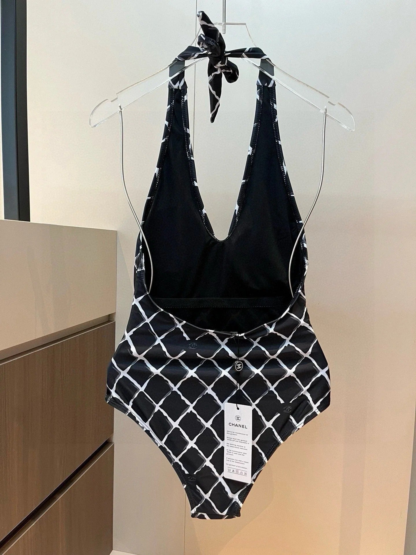 CC BIKINI SWIMSUIT SET IN WHITE CHECKERED PRINT ON BLACK BACKGROUND 624545