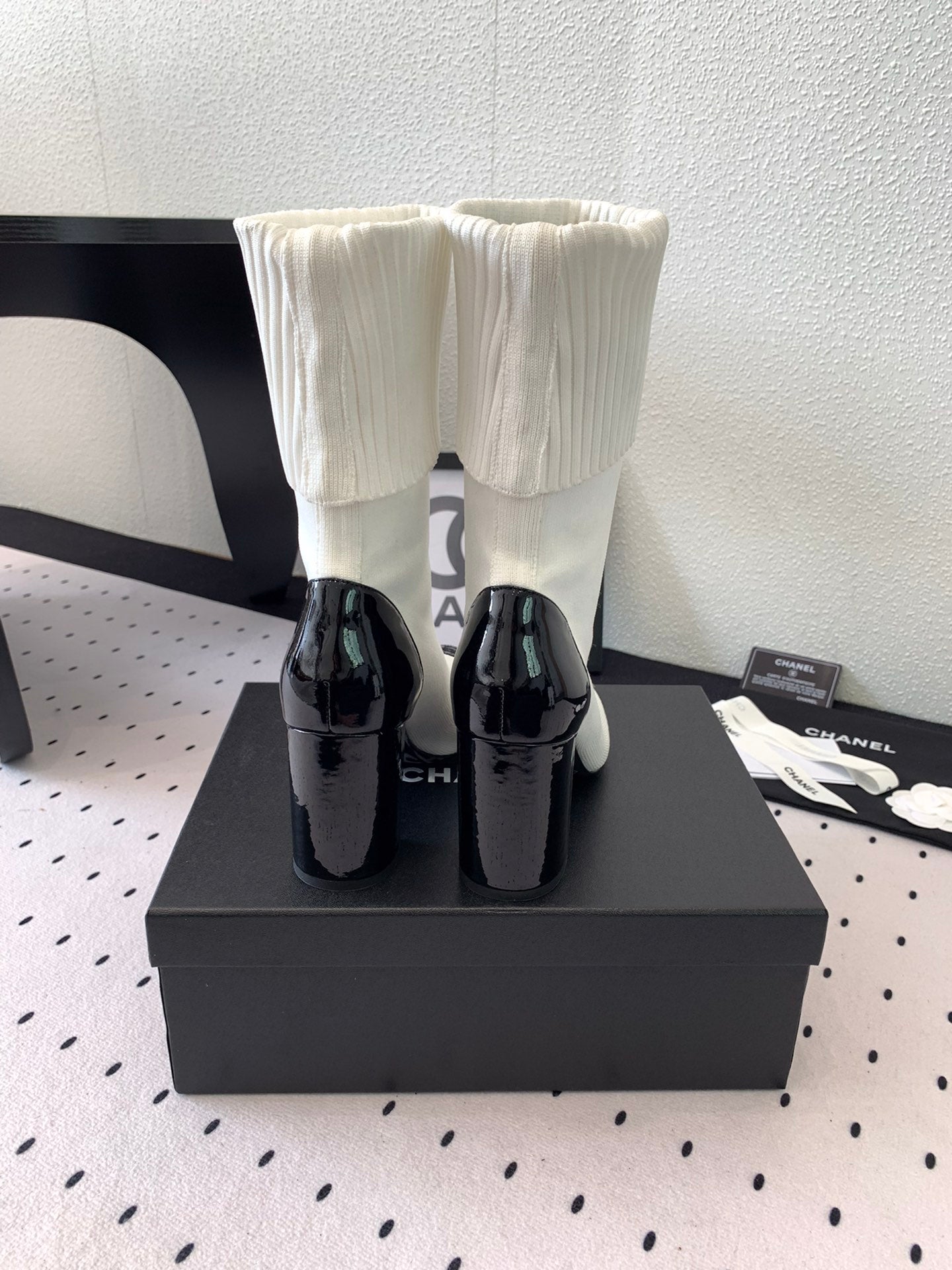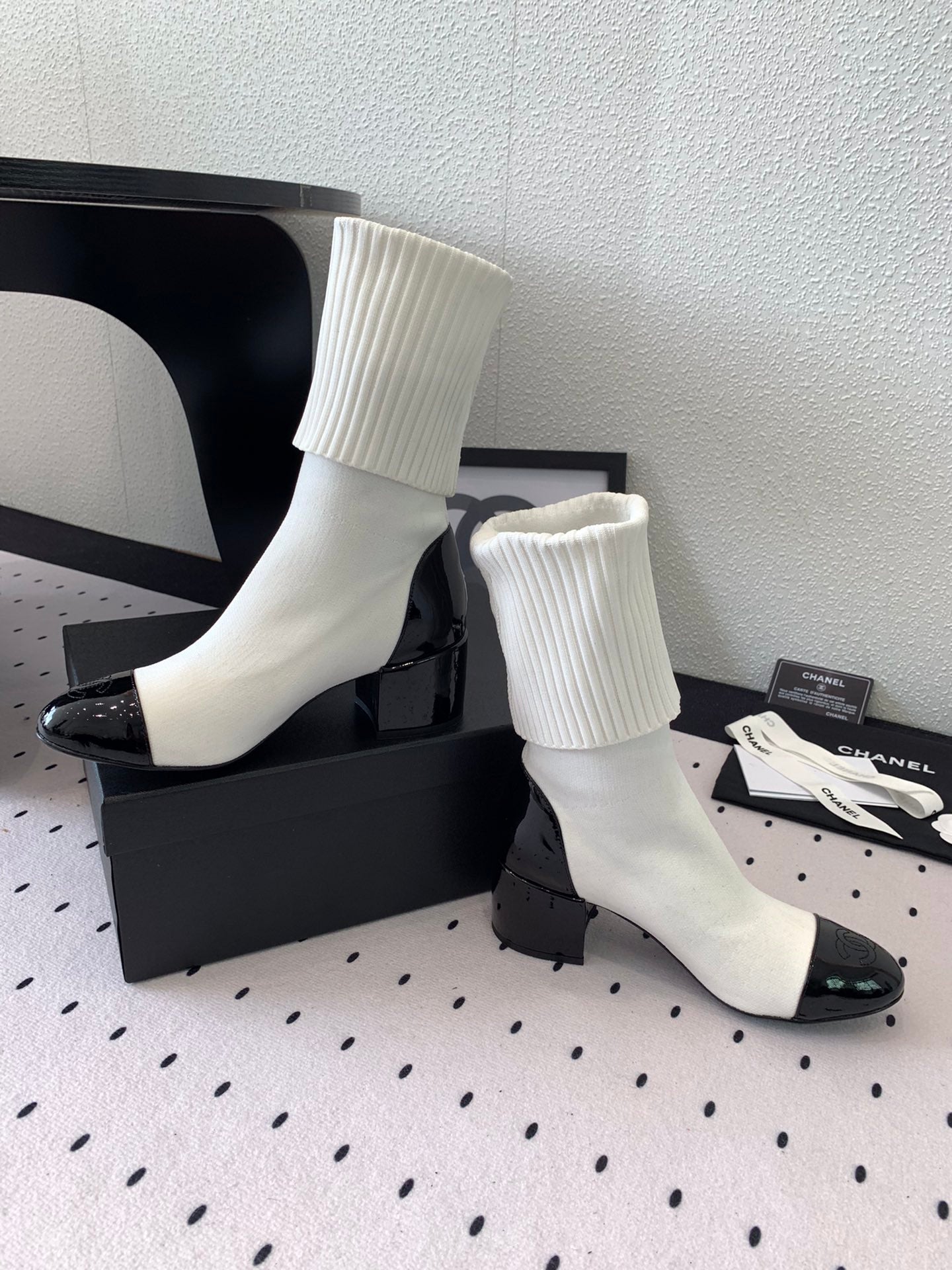 CC Short Boots 55mm White Black Wool Mix Glossy Cowhide 938067